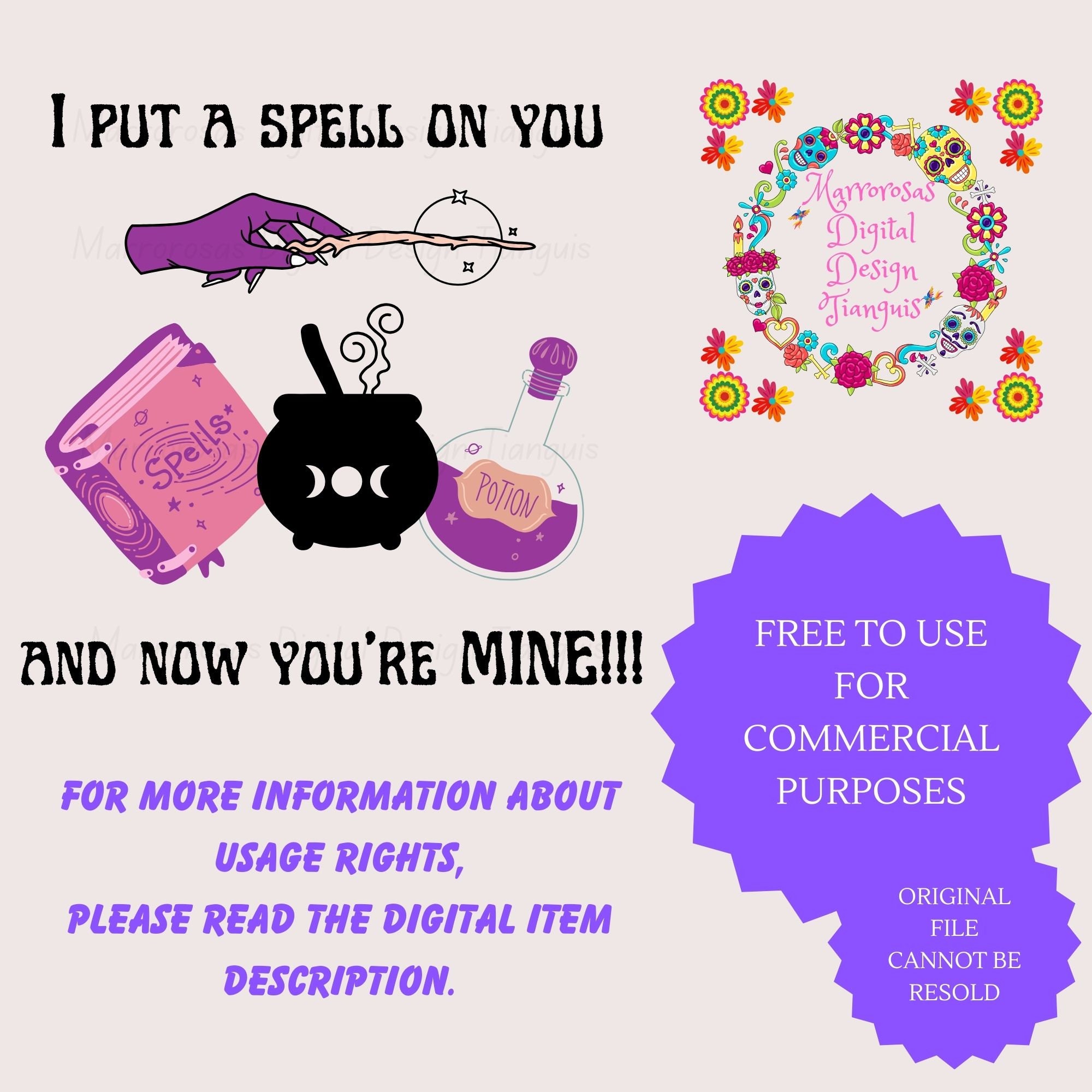 If you are looking for an authentic and very Halloween (Hocus Pocus) inspired digital design then this file is for you. I Put A Spell On You and Now You're Mine is a very original and colorful artwork that can be used in many different ways. Great for gifting either him or her. This digital design product comes in 2 different file types (Png & Jpg) to accommodate any of your needs. Files are resizable and printable!
