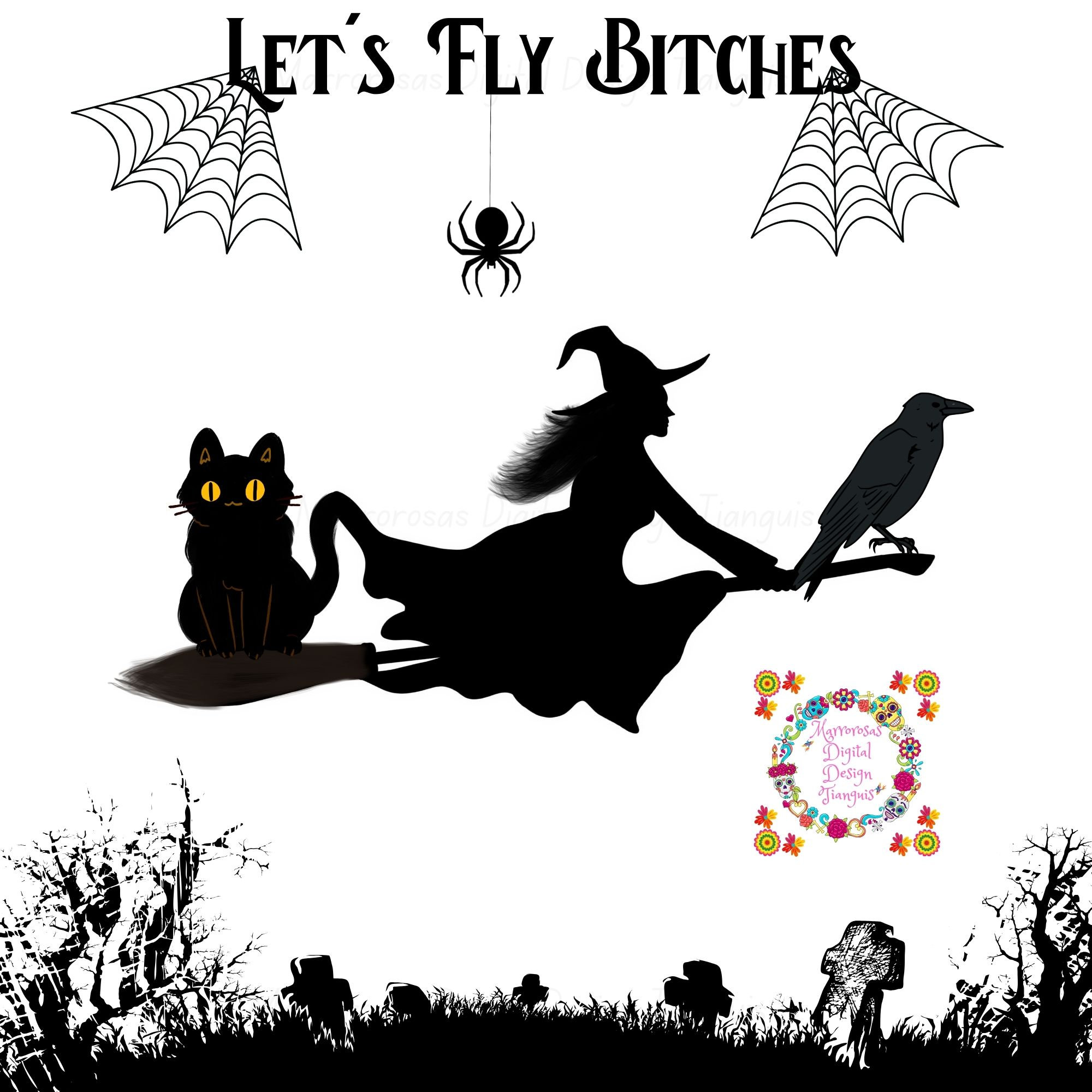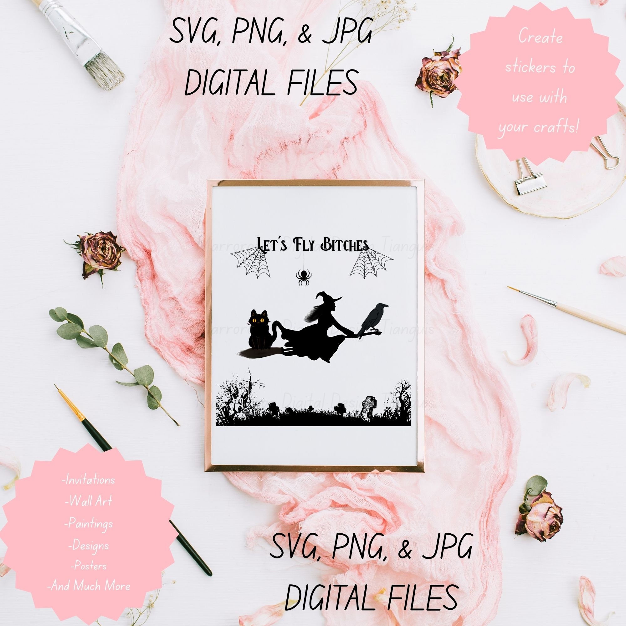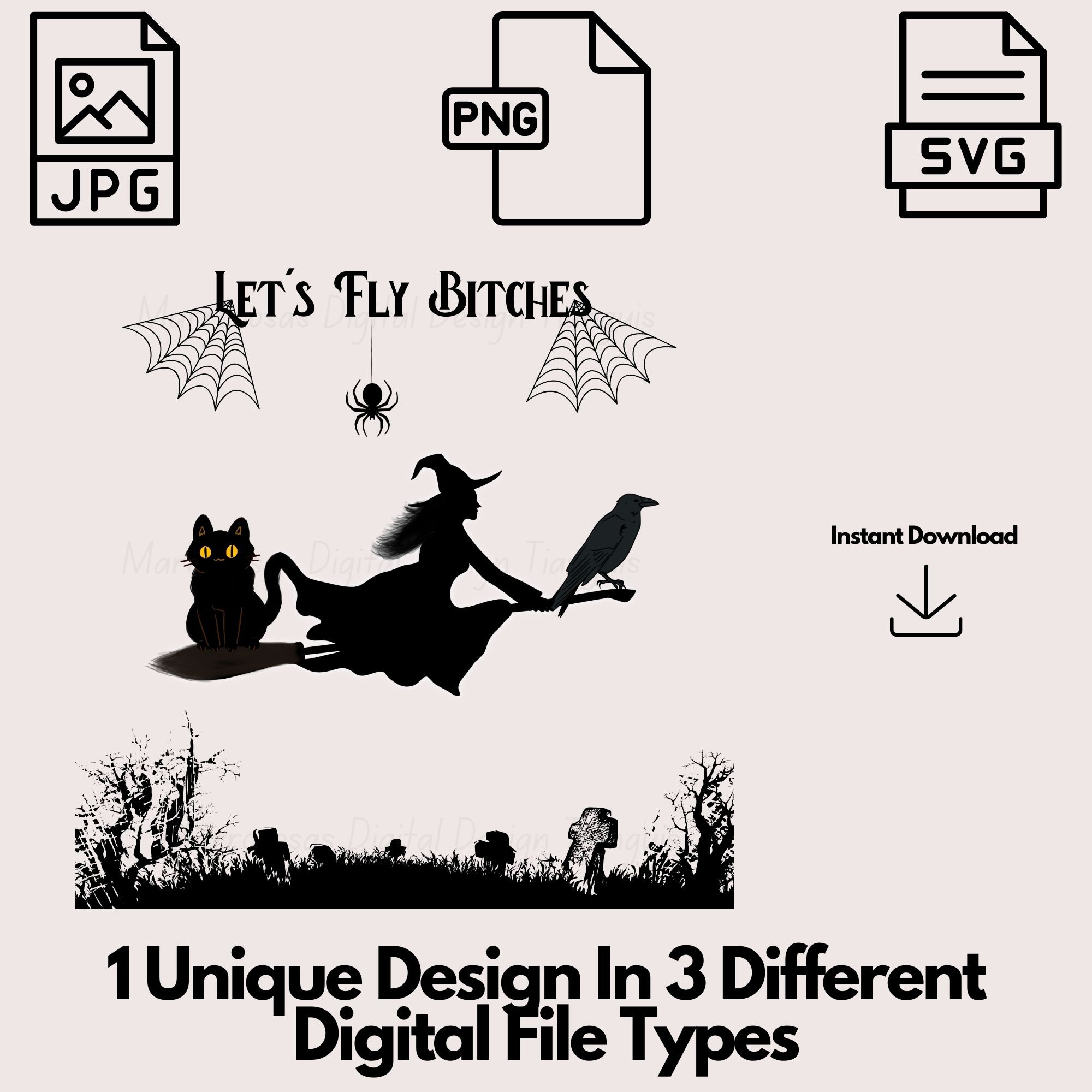 If you are looking for an Authentic and Very Creative Halloween inspired digital design then this file is for you. Let's Fly Bitches is a very original and colorful artwork that can be used in many different ways. Great for gifting either him or her. This digital design product comes in 3 different file types (JPG,PNG, & SVG) to accommodate any of your needs. Files are resizable and printable!