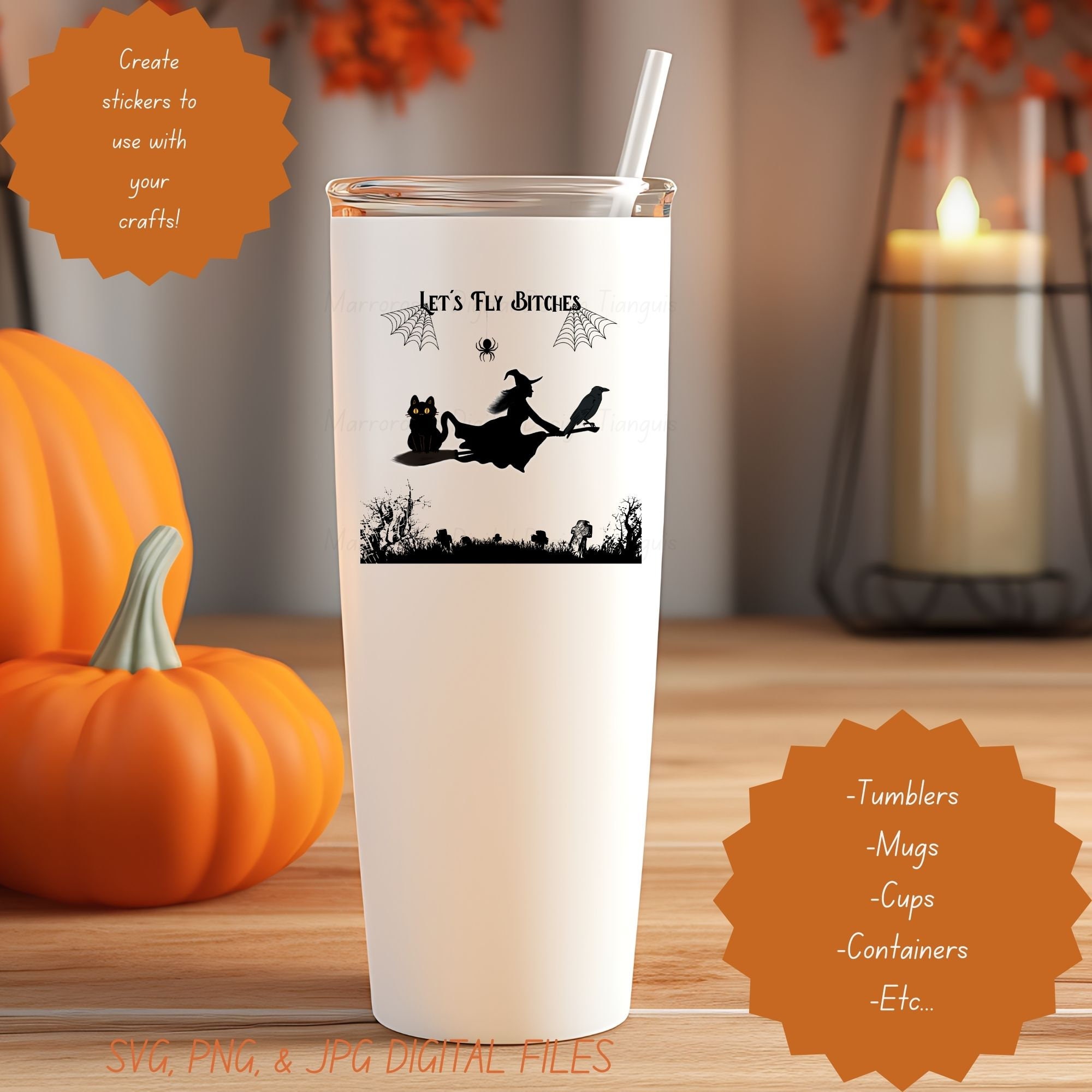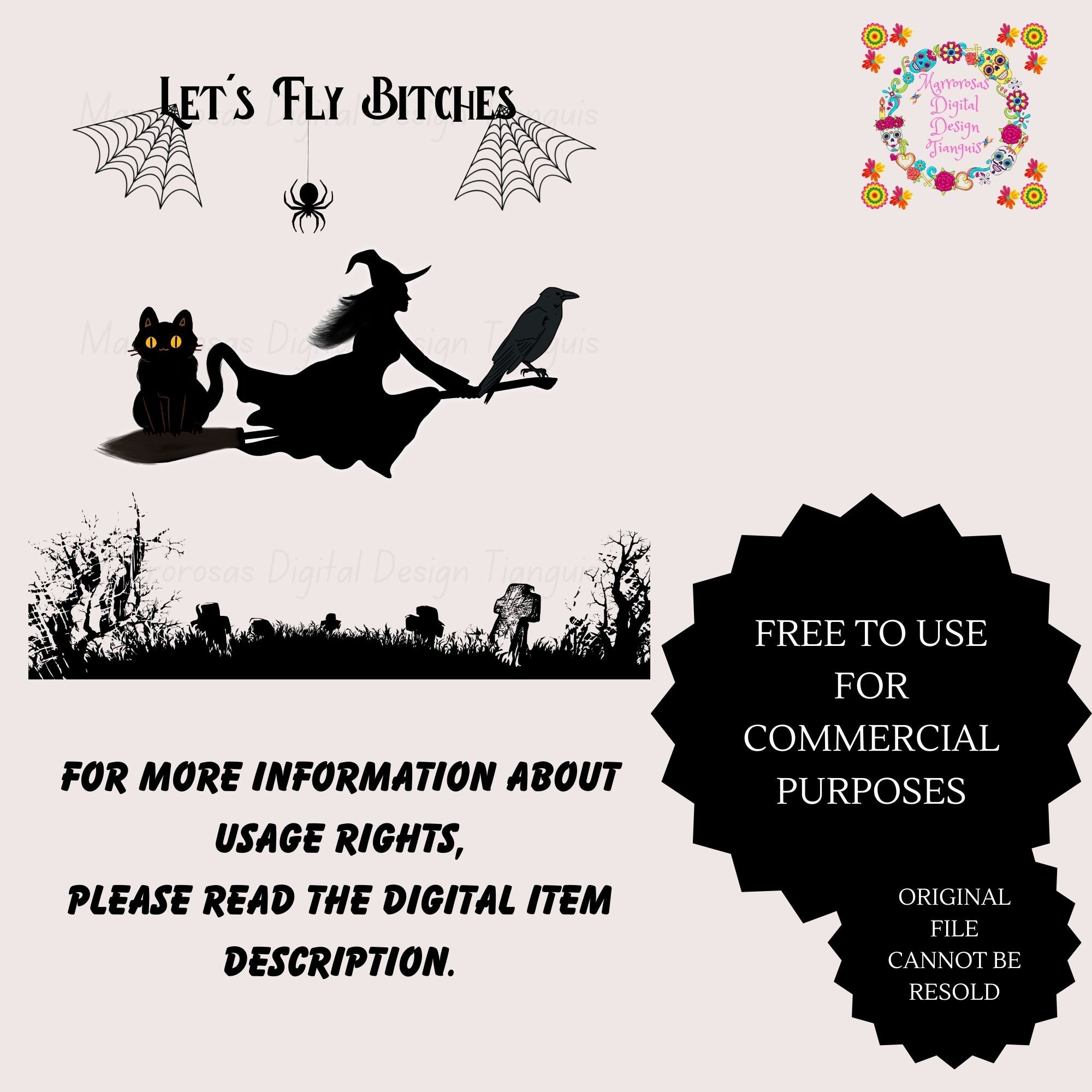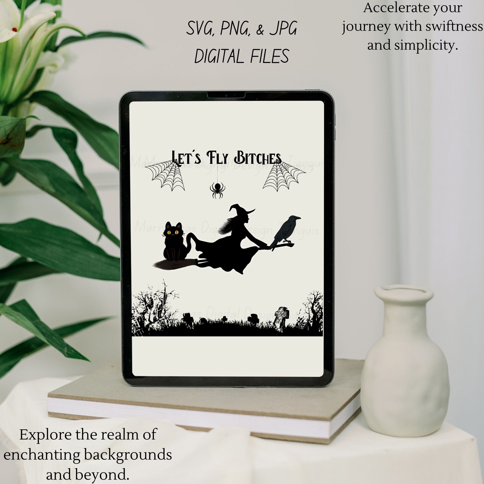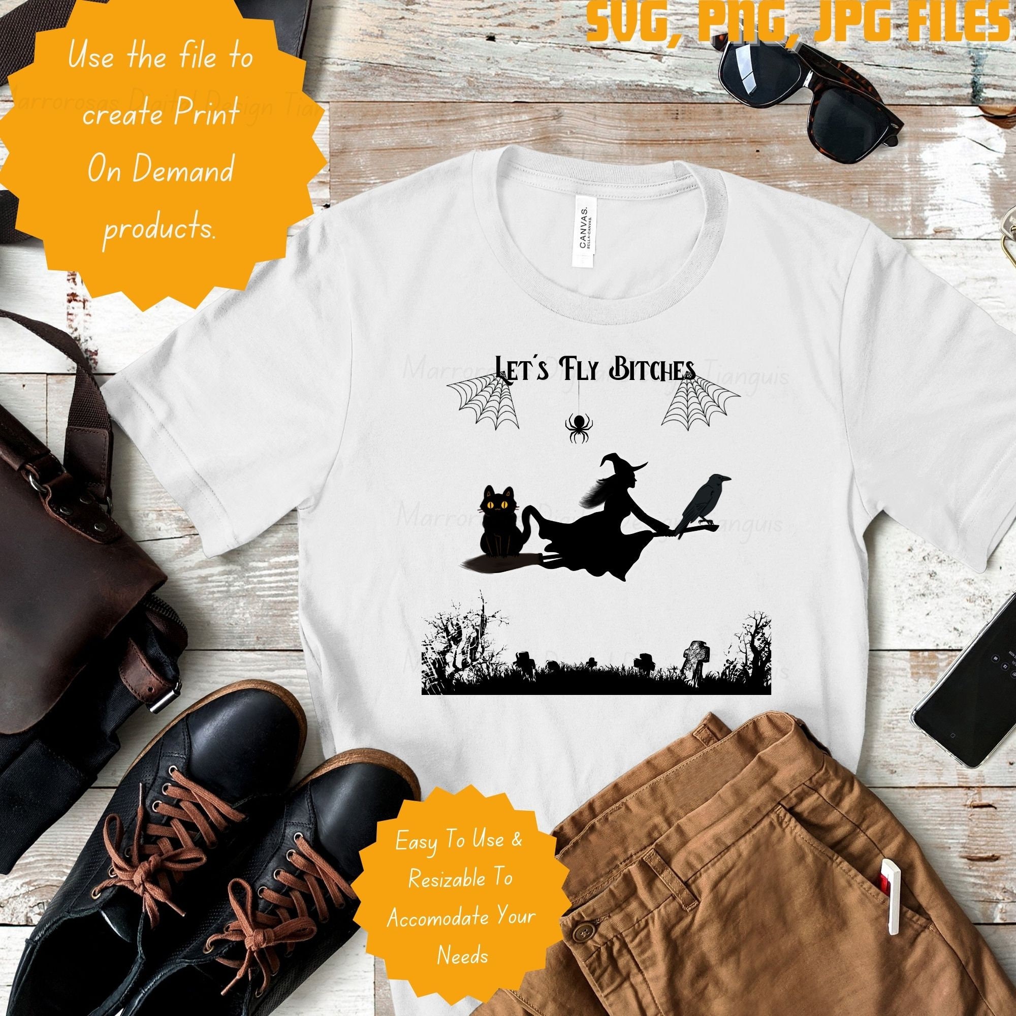 If you are looking for an Authentic and Very Creative Halloween inspired digital design then this file is for you. Let's Fly Bitches is a very original and colorful artwork that can be used in many different ways. Great for gifting either him or her. This digital design product comes in 3 different file types (JPG,PNG, & SVG) to accommodate any of your needs. Files are resizable and printable!