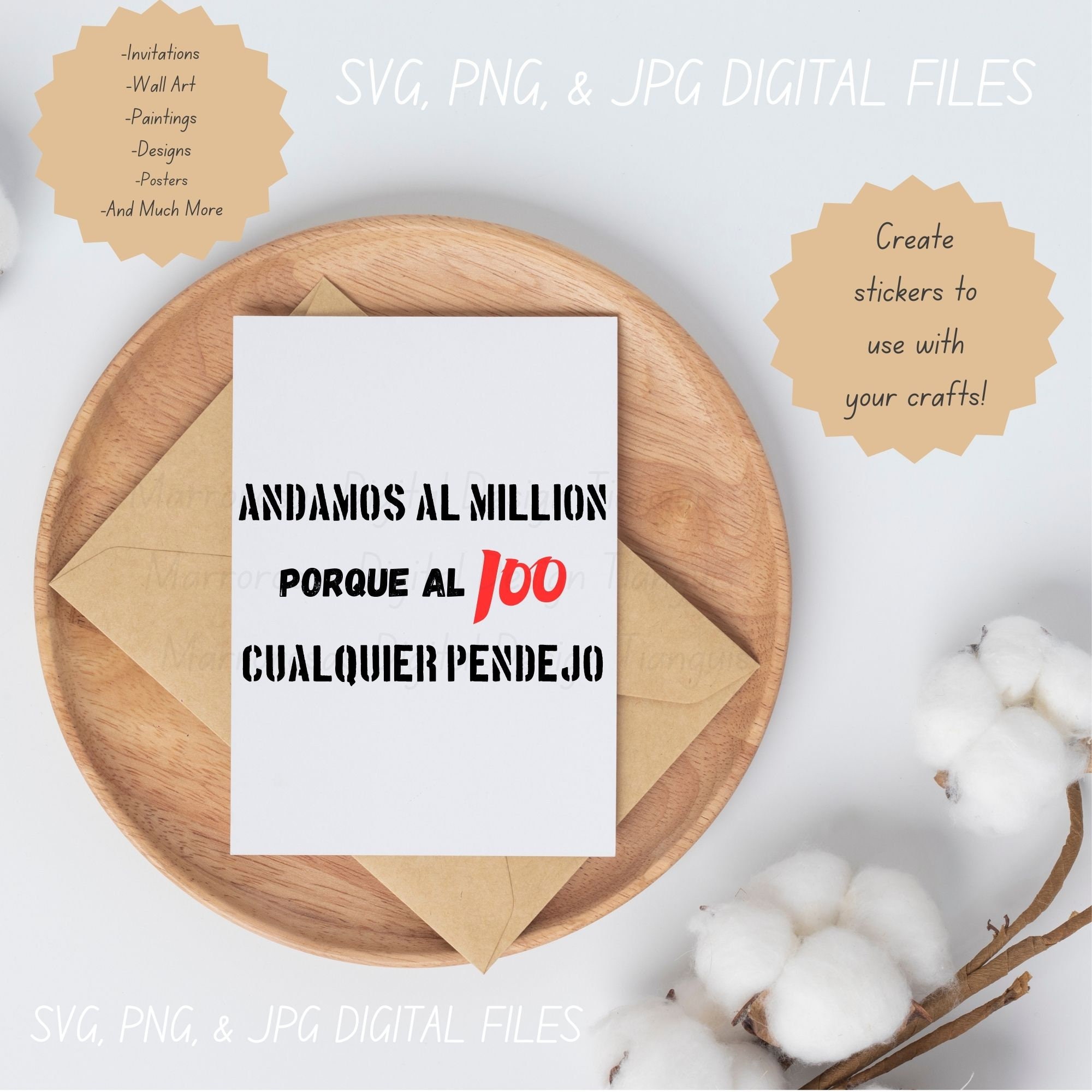 If you are looking for an authentic, colorful, and cute Latin Saying inspired digital design then this file is for you. Andamos al Million is a very latin saying, colorful, and original digital design/art that can be used in many different ways. Great for gifting either him or her. This digital design product comes in 3 different DIGITAL file types (PNG,JPG, SVG) to accommodate any of your needs. Files are resizable and printable!