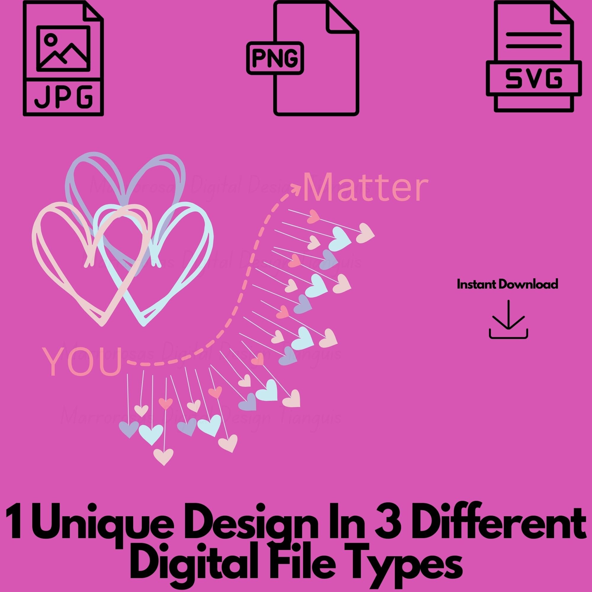 If you are looking for an authentic, original, loving Mental Health inspired digital design then this file is for you. You Matter is an adorable cared for Motivational inspired design which represents the admiration towards ourselves which is created to be a very original digital design/art that can be used in many different ways. Great for gifting either him or her. This digital design product comes in 3 different DIGITAL file types (PNG,JPG, SVG) to accommodate any of your needs. Files are resizable and printable!