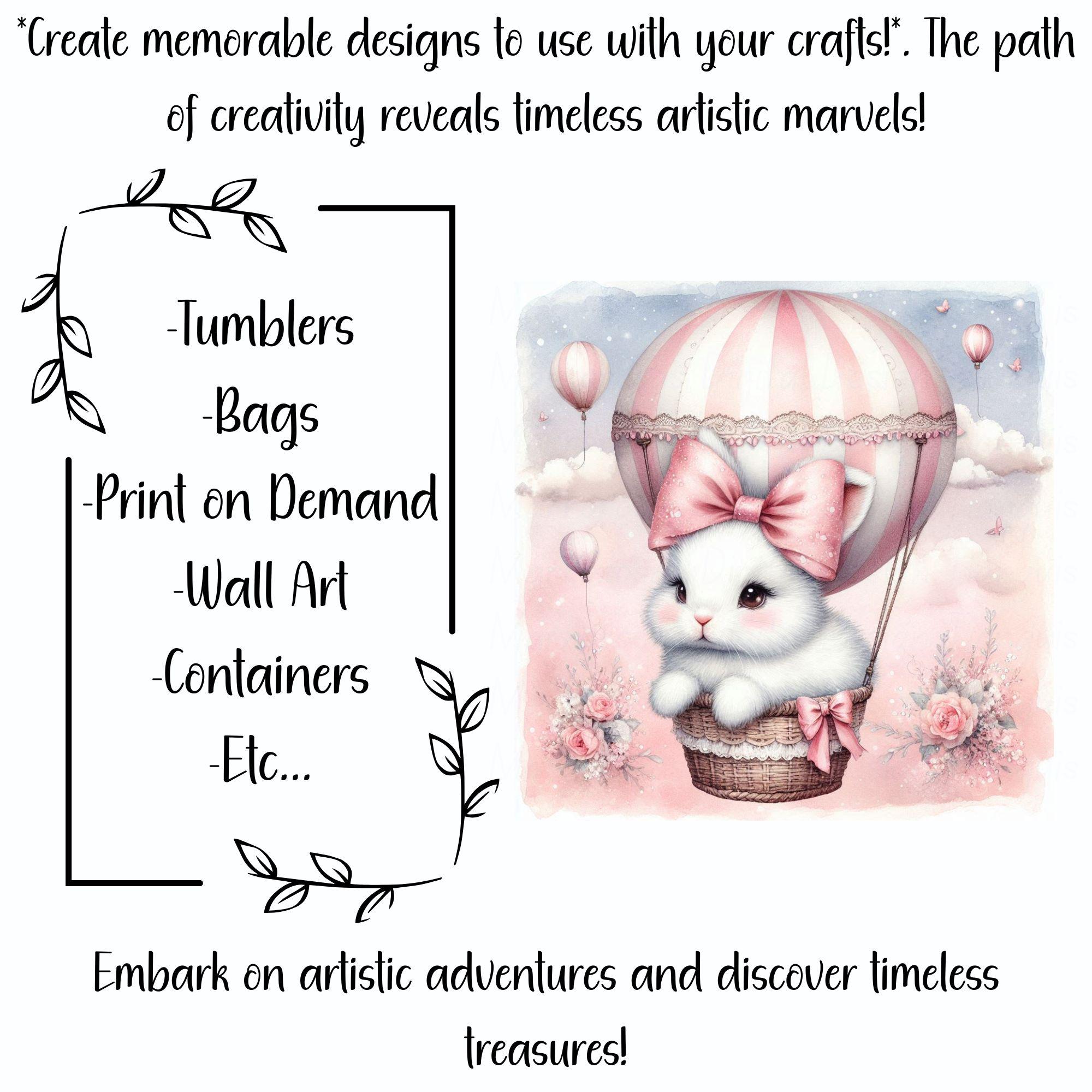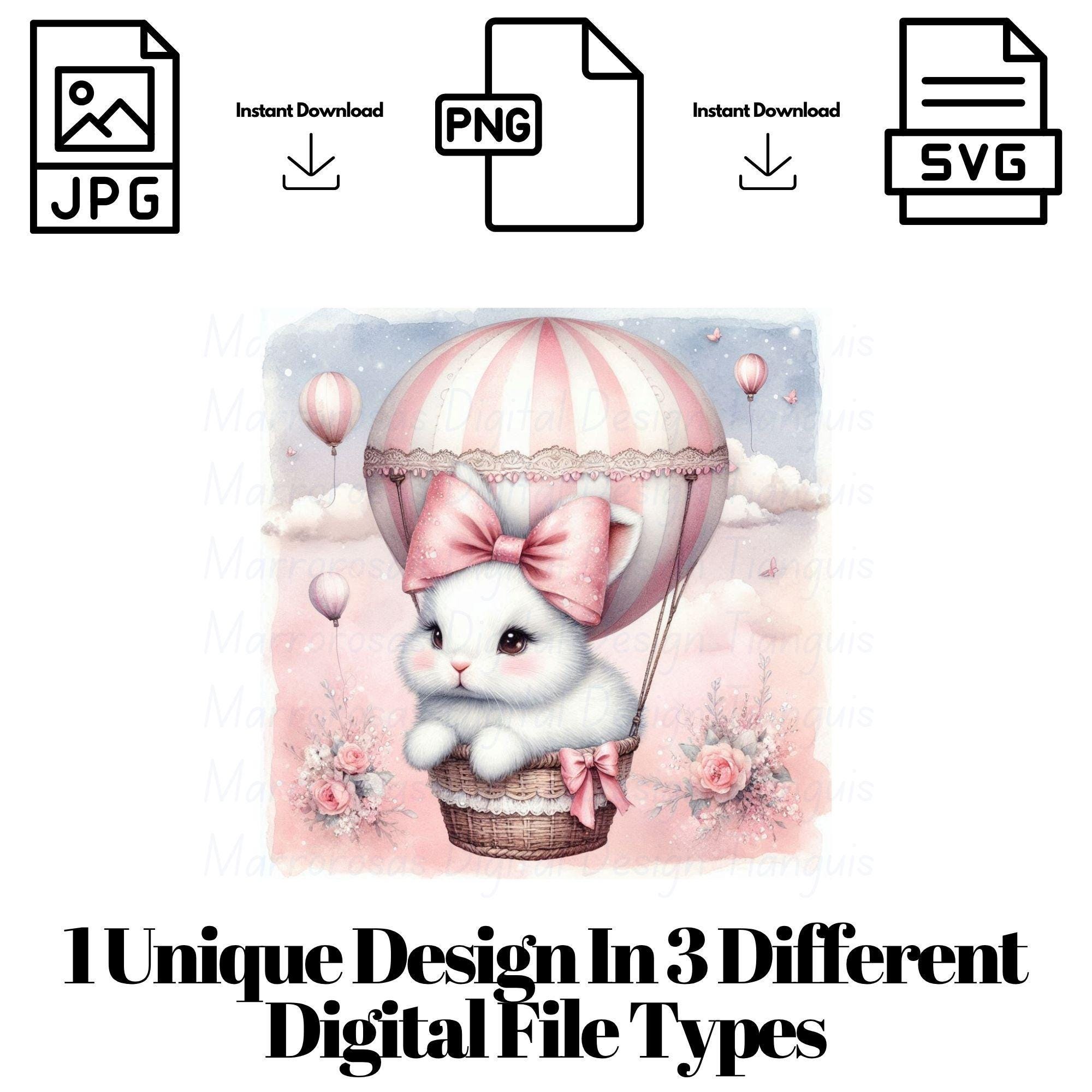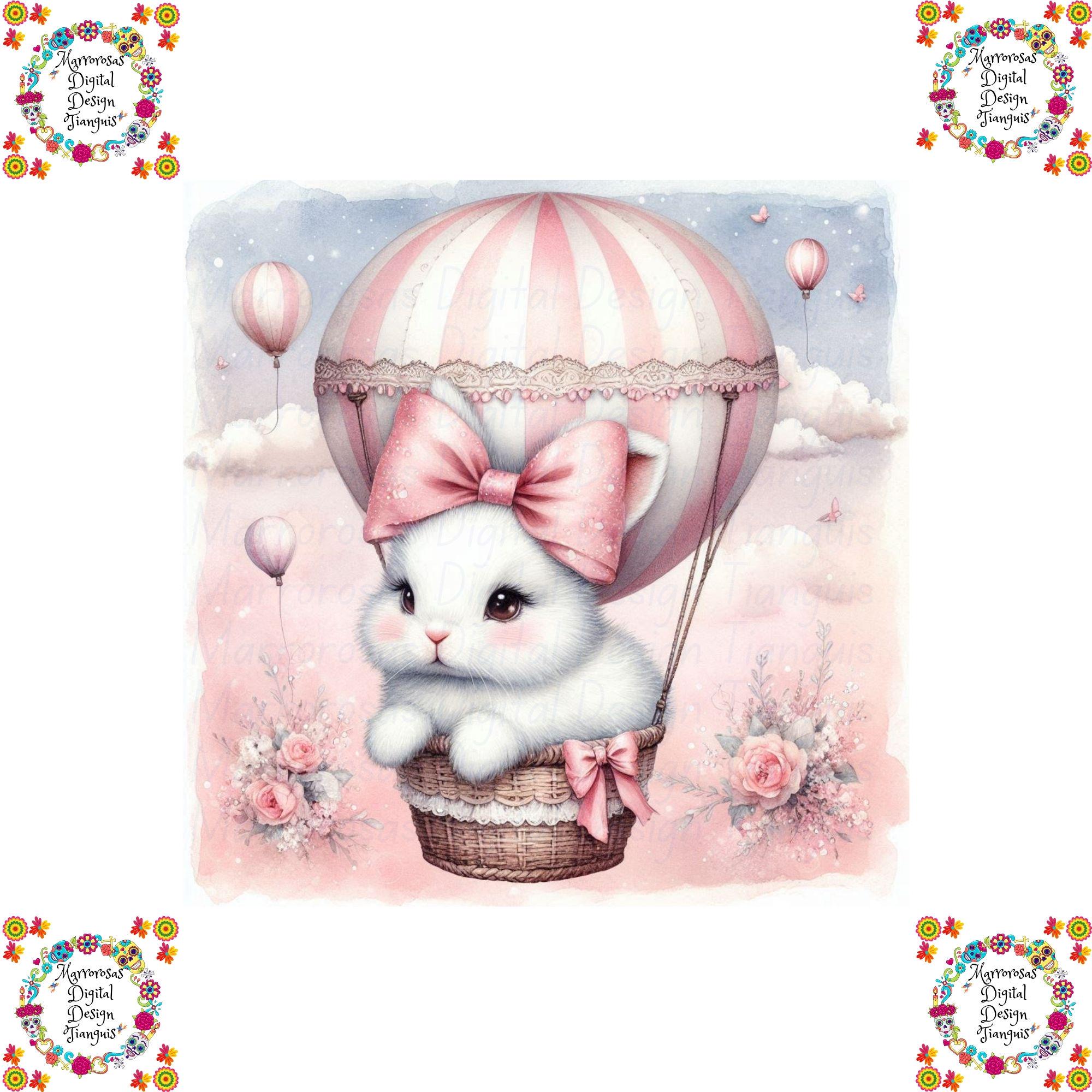 Bring pure sweetness and pastel charm to your creative projects with this adorable digital design featuring a fluffy white bunny floating gently in a pink and white striped hot air balloon. The bunny, adorned with a sparkling pink bow, sits gracefully in a wicker basket trimmed with lace and ribbon — surrounded by soft clouds, blushing roses, and dainty butterflies drifting through a dreamy sky.