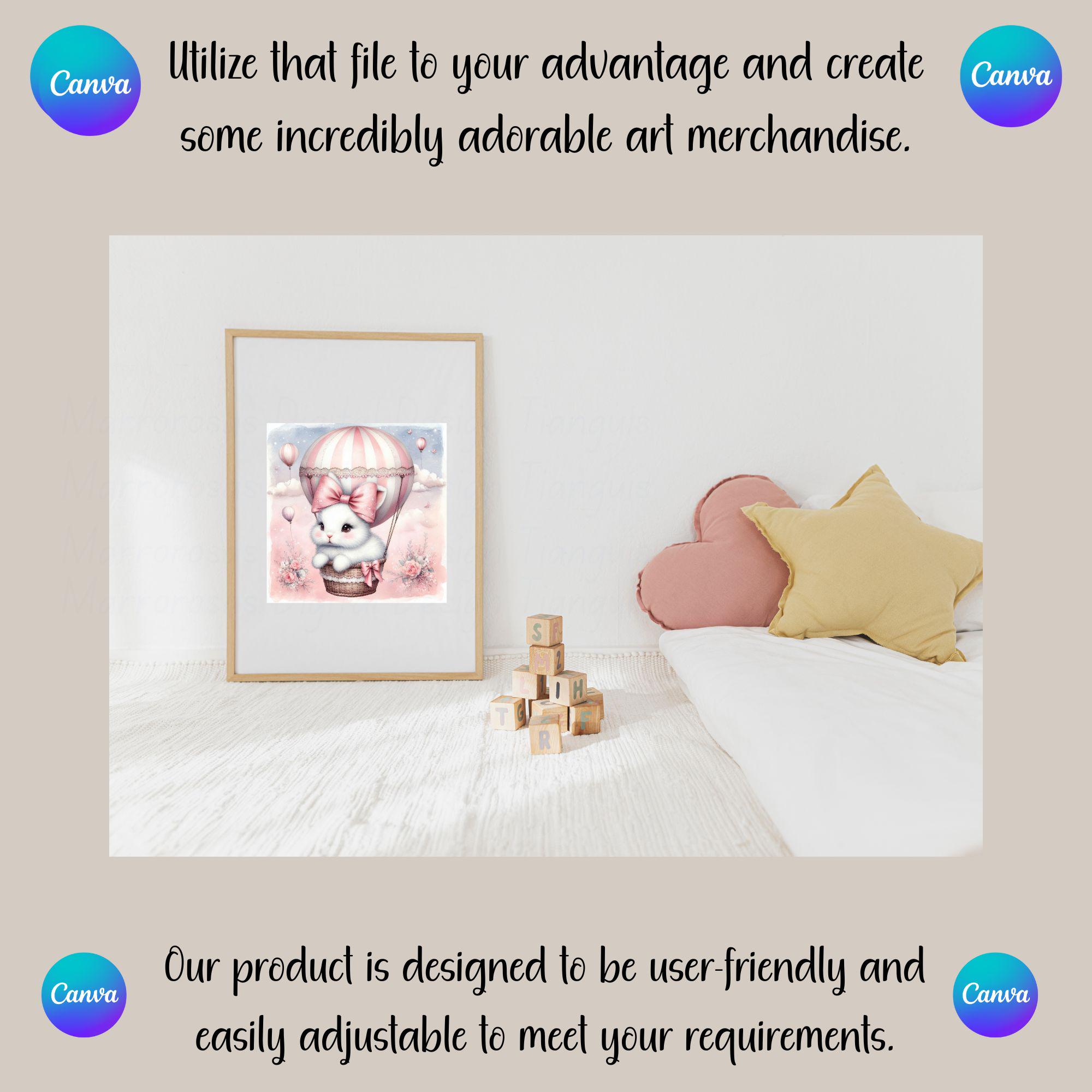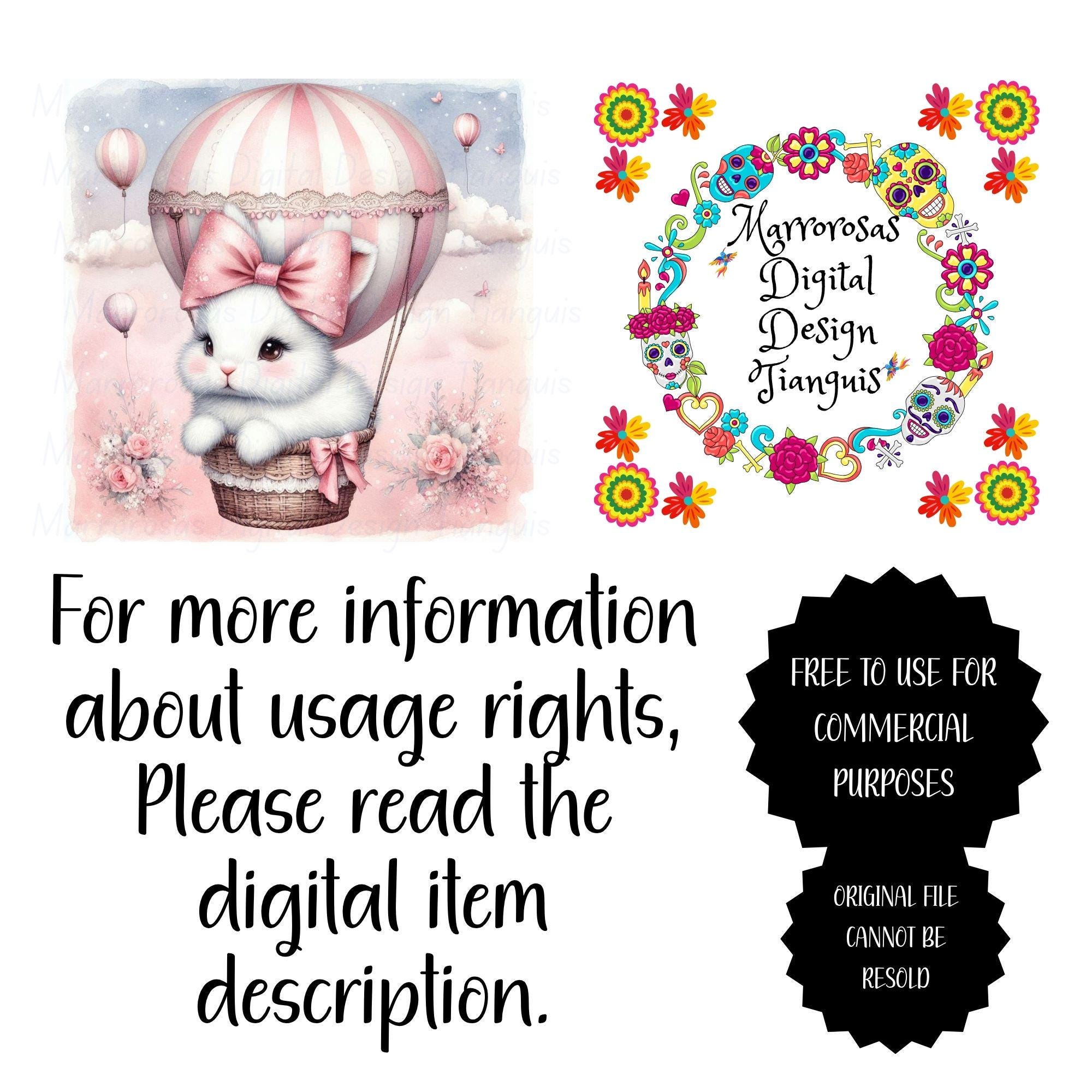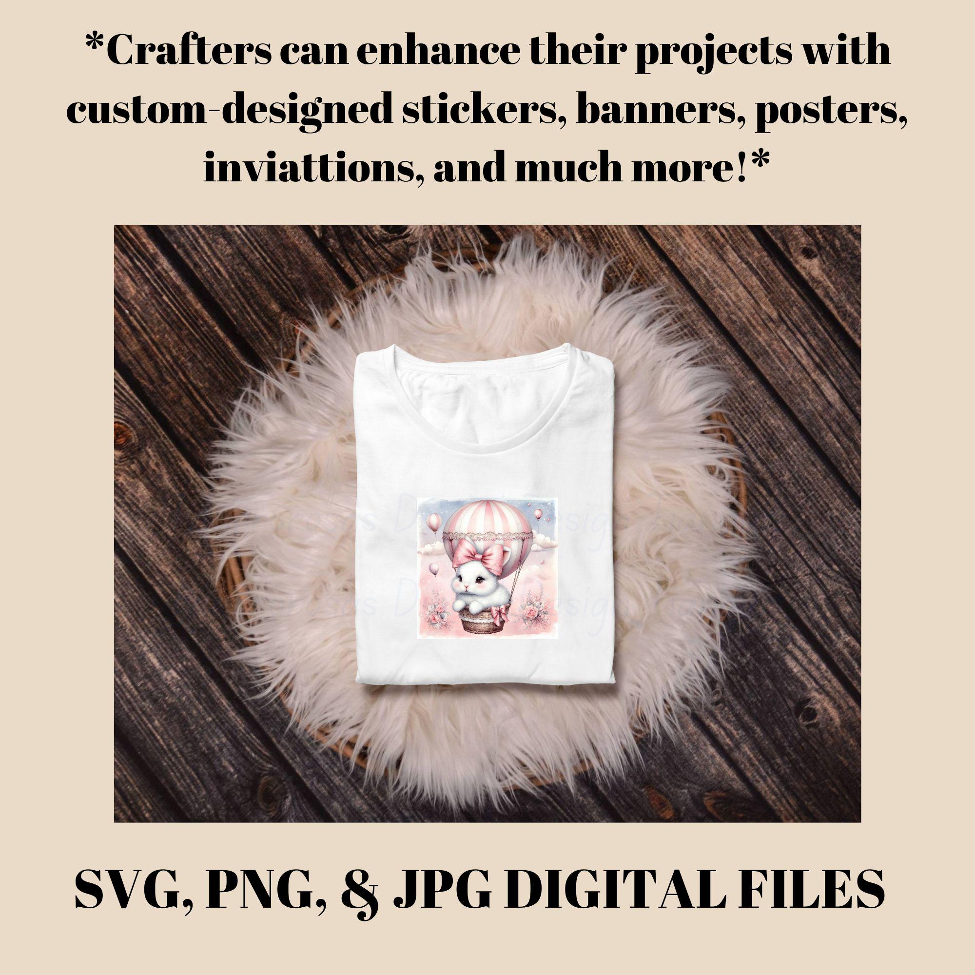 Bring pure sweetness and pastel charm to your creative projects with this adorable digital design featuring a fluffy white bunny floating gently in a pink and white striped hot air balloon. The bunny, adorned with a sparkling pink bow, sits gracefully in a wicker basket trimmed with lace and ribbon — surrounded by soft clouds, blushing roses, and dainty butterflies drifting through a dreamy sky.