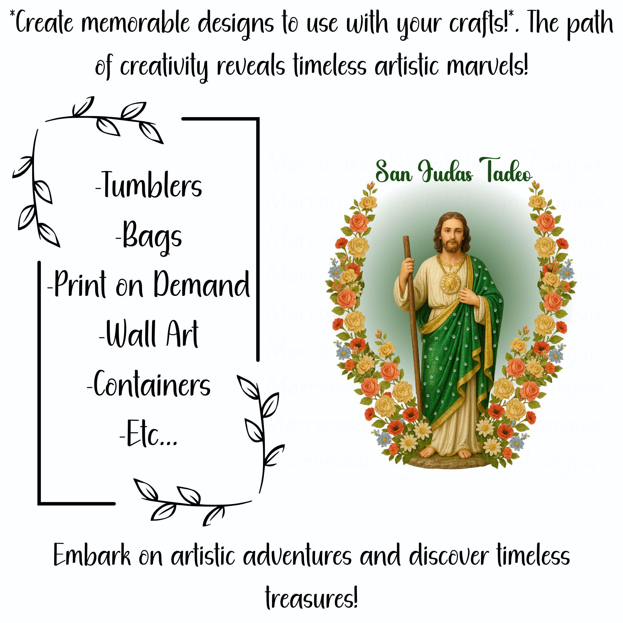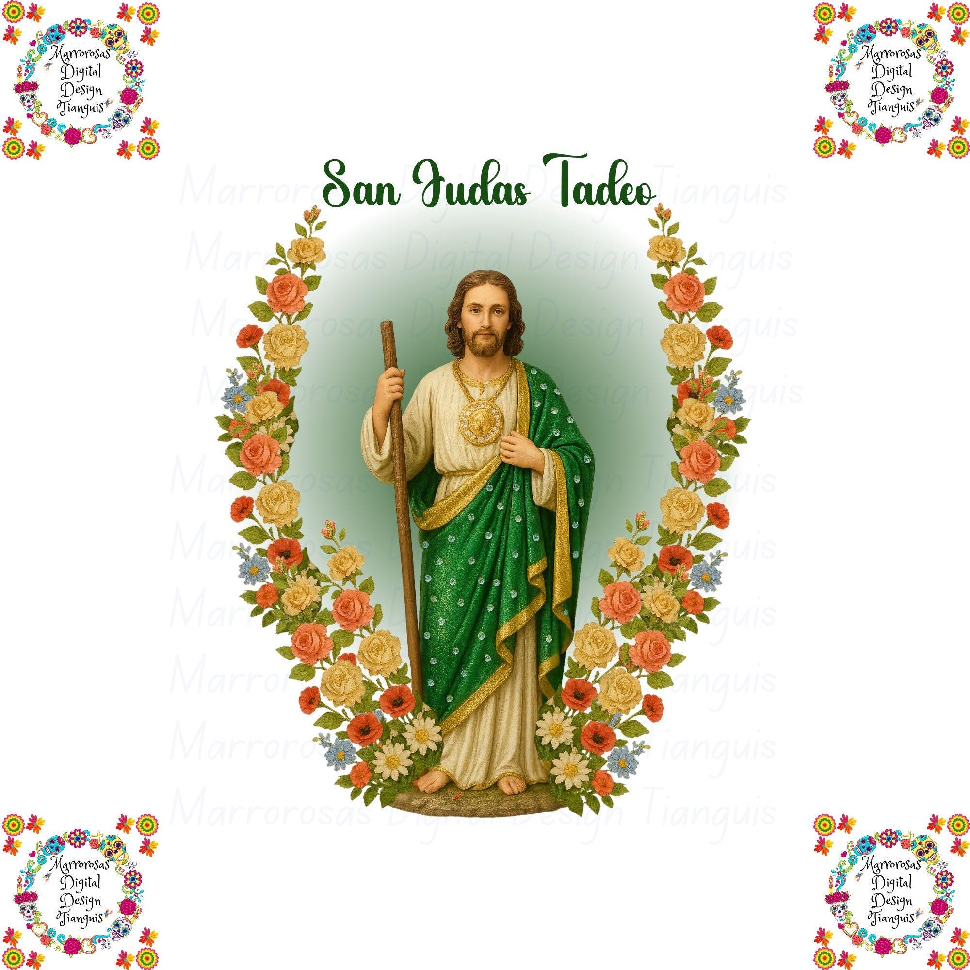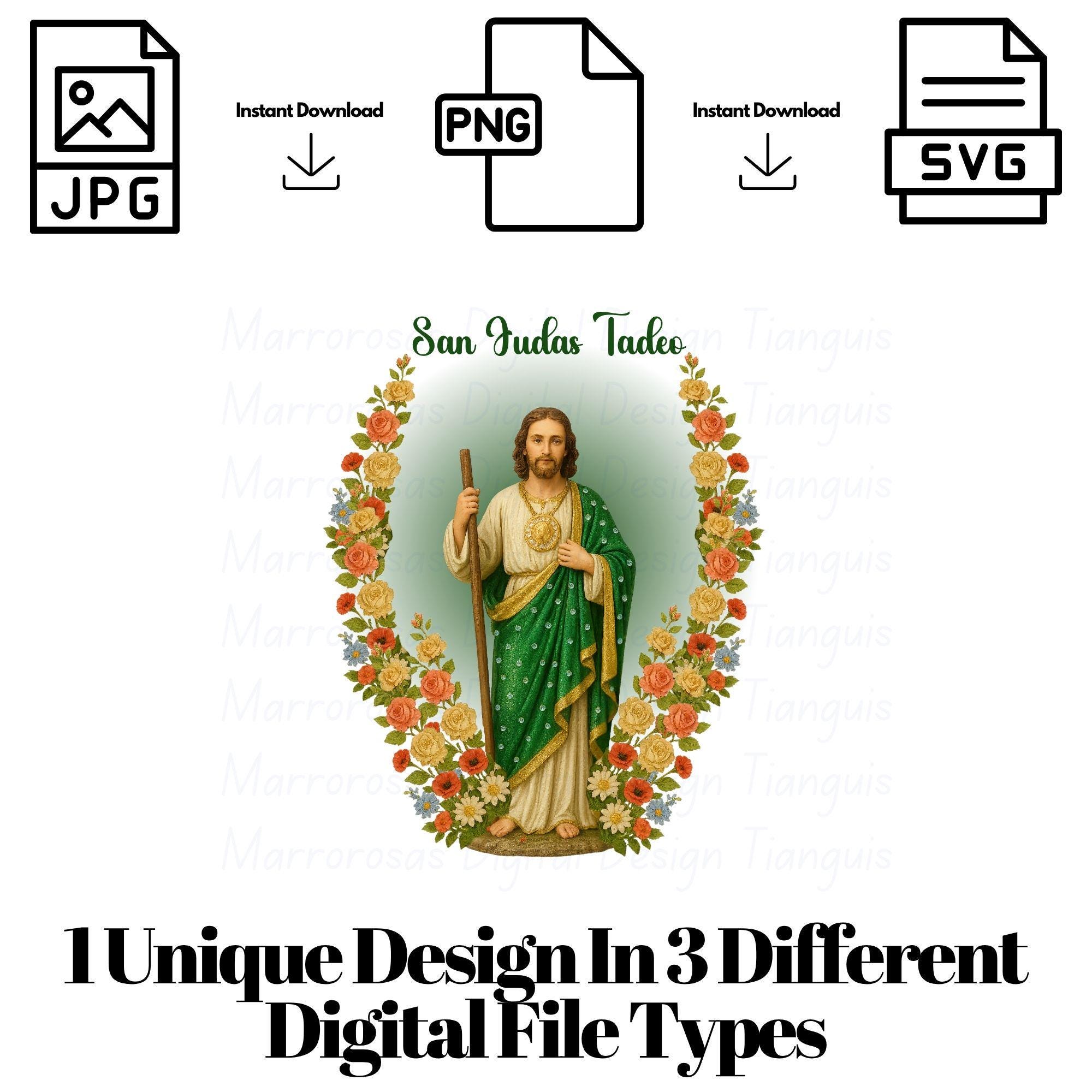 This illustration depicts San Judas Tadeo (St. Jude Thaddeus) surrounded by blooming roses and delicate greenery, symbolizing strength, healing, and faith. The colors are rich and uplifting — deep greens, warm golds, and soft florals — creating a spiritual and comforting design perfect for personal devotion or inspirational décor. Ideal for religious crafts, wall prints, prayer journals, candles, shirts, mugs, or devotional cards, this file can be used in both home and church settings. The design works beautifully for faith-based creators, Hispanic heritage gifts, and anyone honoring San Judas Tadeo.. San Judas Tadeo Floral is a very cute and lovable digital design/art that can be used in many different ways. Great for gifting either him or her. This digital design product comes in 3 different DIGITAL file types (PNG, SVG, & JPG) and also 1 PDF File to accommodate any of your needs. Files are resizable and printable!