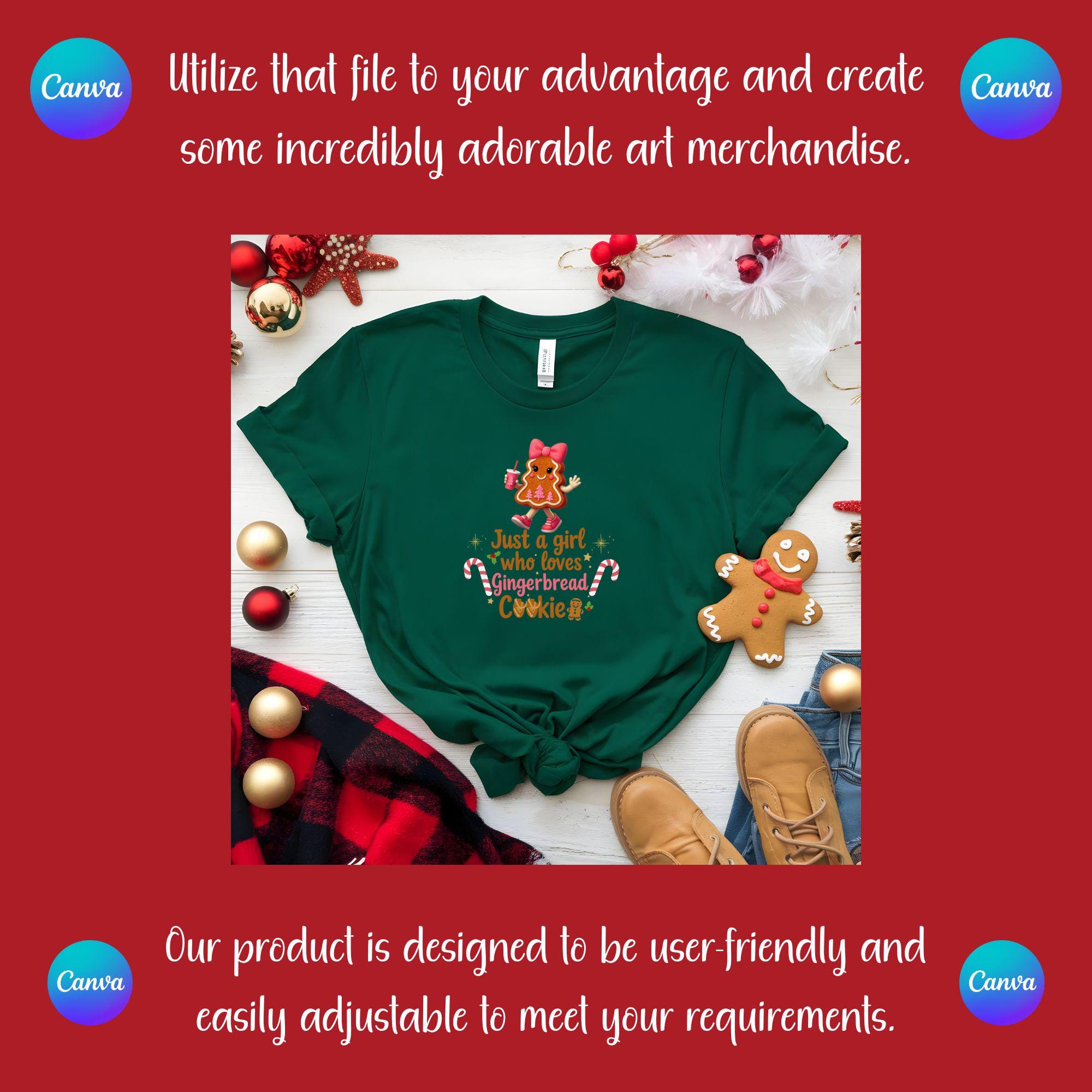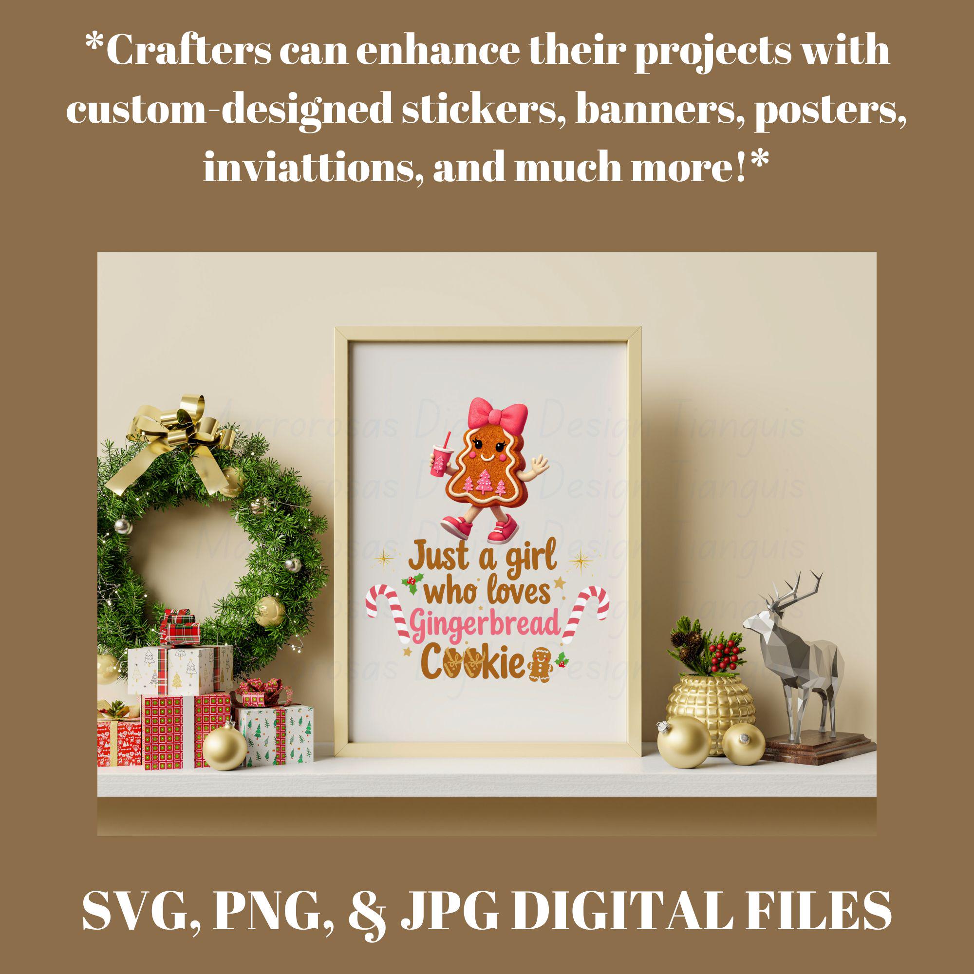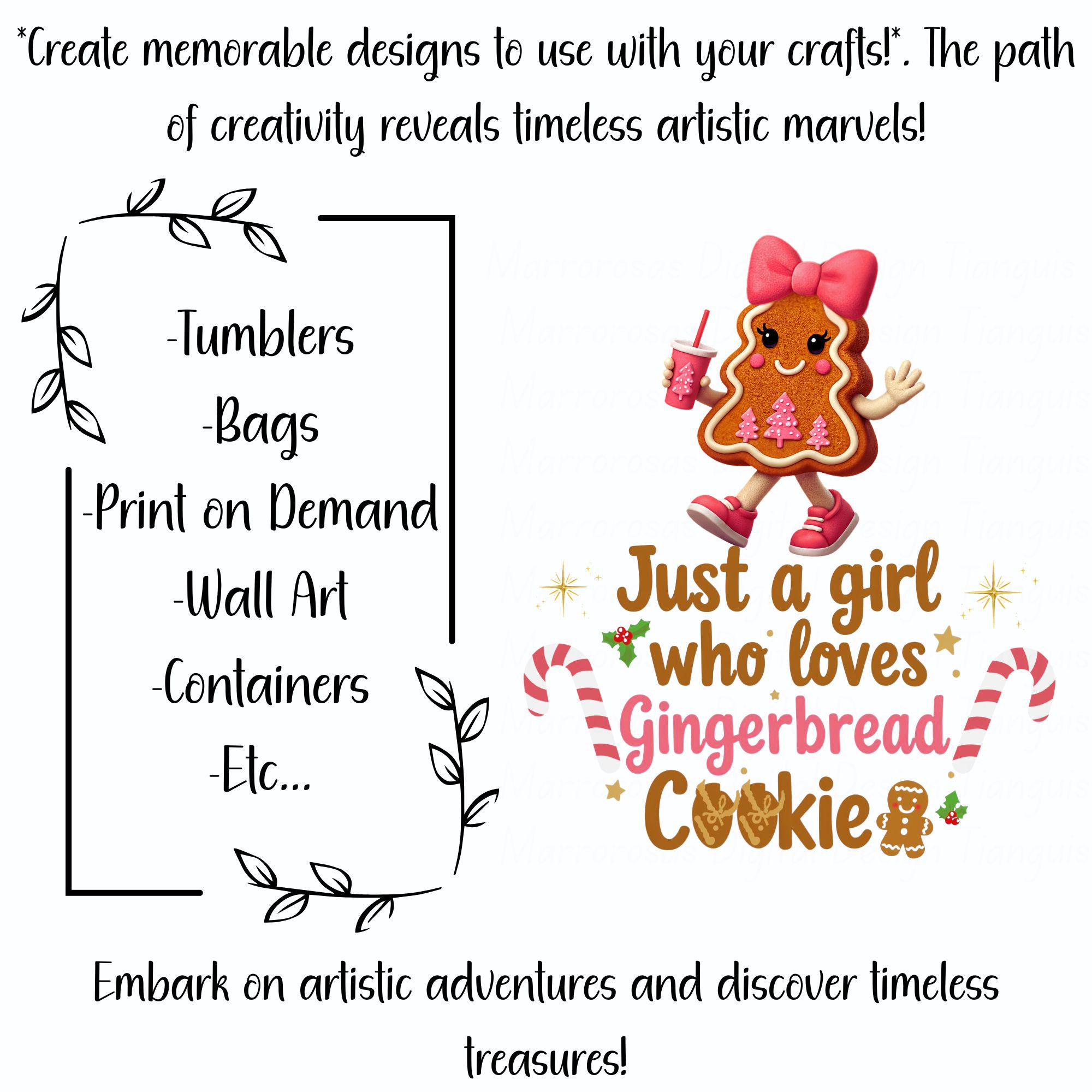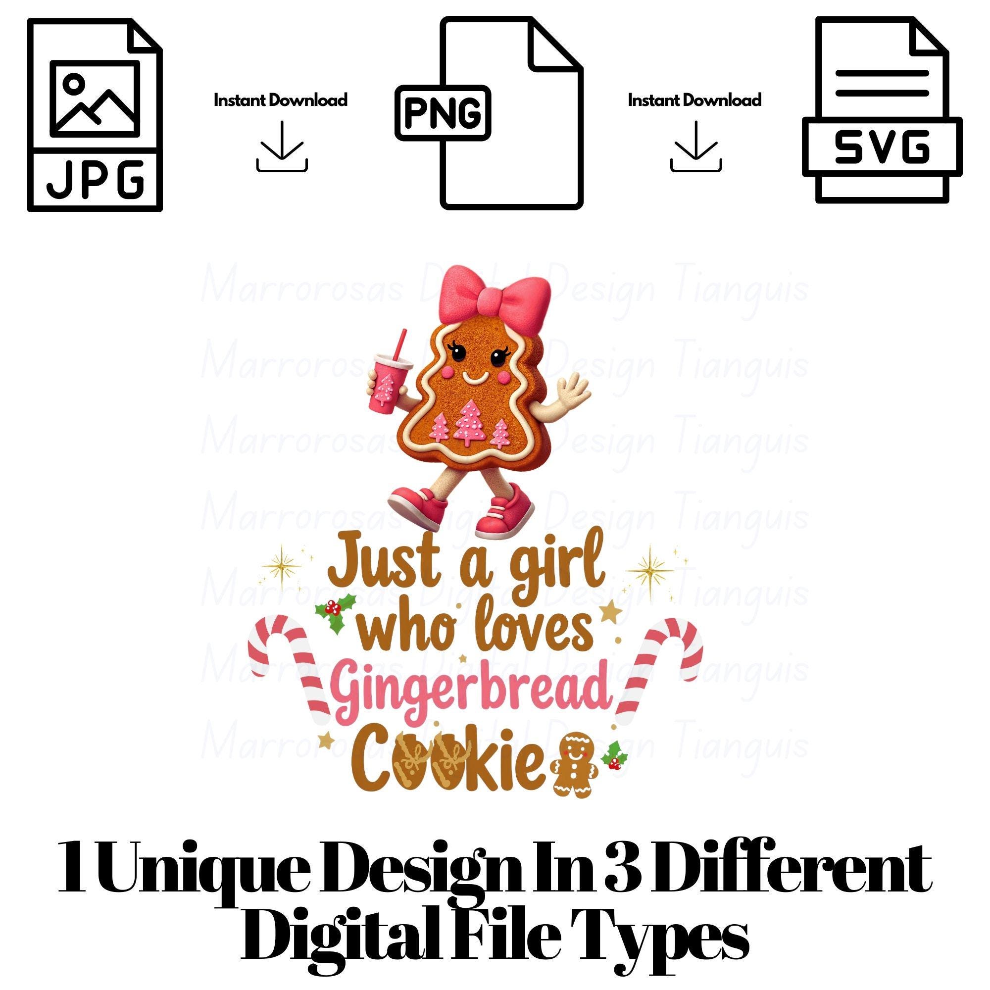 This design blends trendy pink Christmas aesthetics with cozy gingerbread nostalgia, making it ideal for creating standout holiday apparel and merchandise your customers will love... Just a girl who loves gingerbread cookies is a very cute and lovable digital design/art that can be used in many different ways. Great for gifting either him or her. This digital design product comes in 3 different DIGITAL file types (PNG, SVG, & JPG) and also 1 PDF File to accommodate any of your needs. Files are resizable and printable!