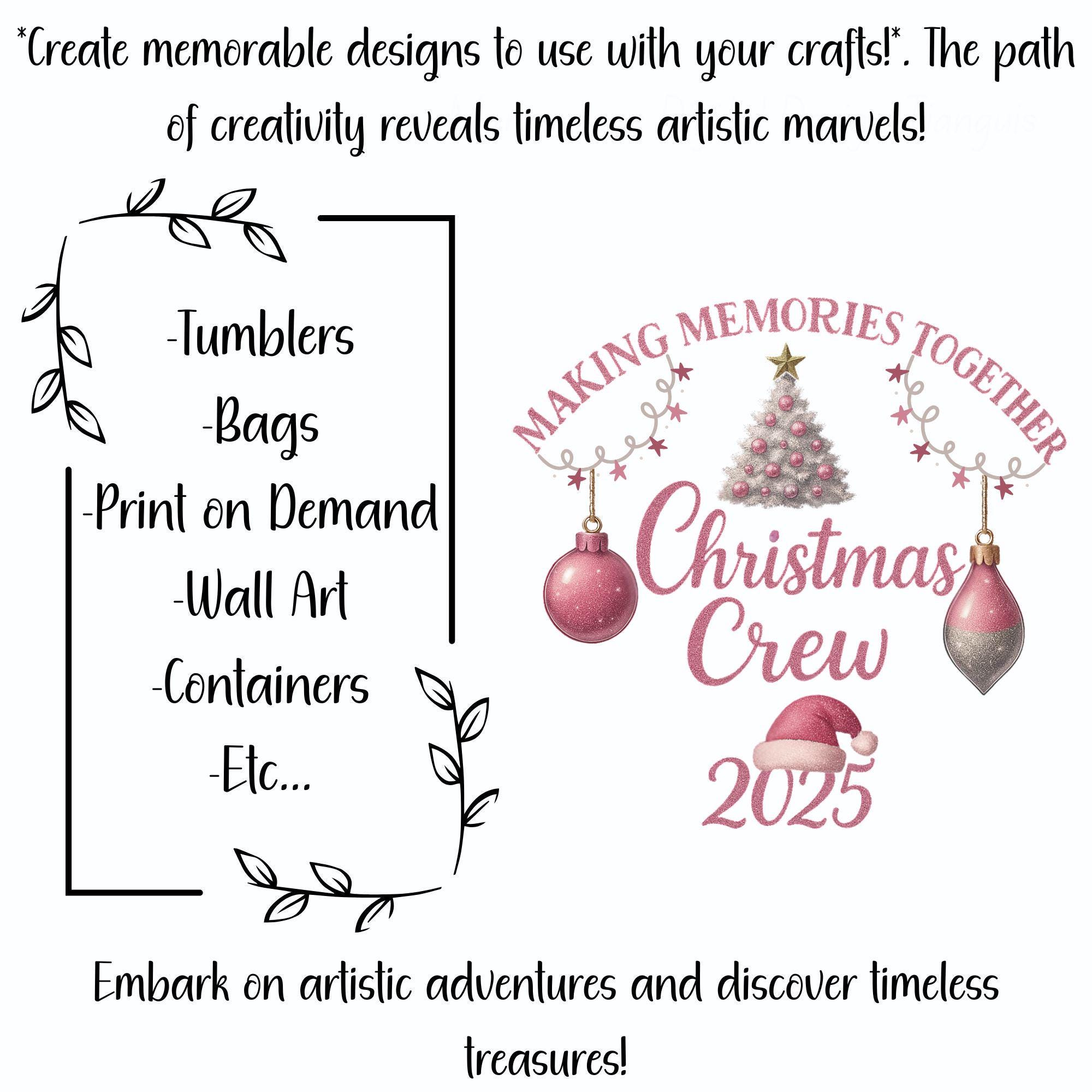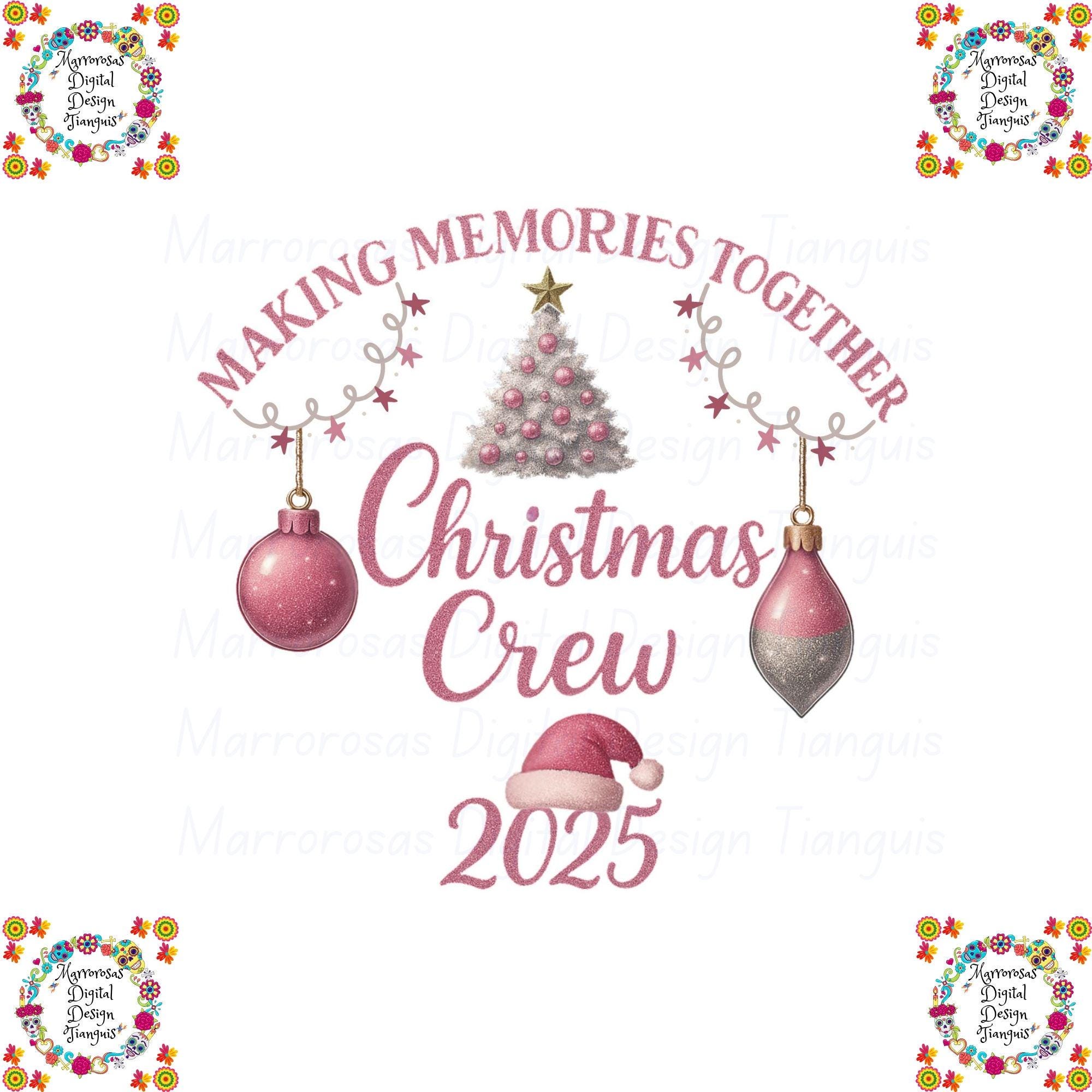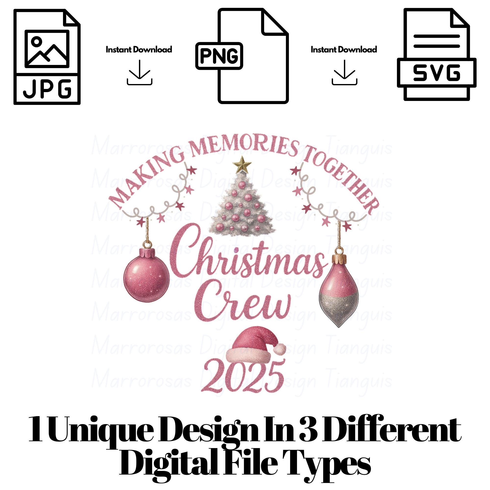 Bring festive charm, family unity, and sparkling holiday style to your Christmas creations with this beautifully crafted pink glitter Christmas crew design! This digital artwork features a soft, snowy white Christmas tree decorated with pink and silver ornaments, elegant glitter-style lettering, aesthetic ornaments, and a cute pink Santa hat resting over “2025.” Perfect for matching family outfits, holiday gatherings, Christmas pajamas, school events, and holiday parties!... Making Memories Together Christmas Crew 2025 is a very cute and lovable digital design/art that can be used in many different ways. Great for gifting either him or her. This digital design product comes in 3 different DIGITAL file types (PNG, SVG, & JPG) and also 1 PDF File to accommodate any of your needs. Files are resizable and printable!