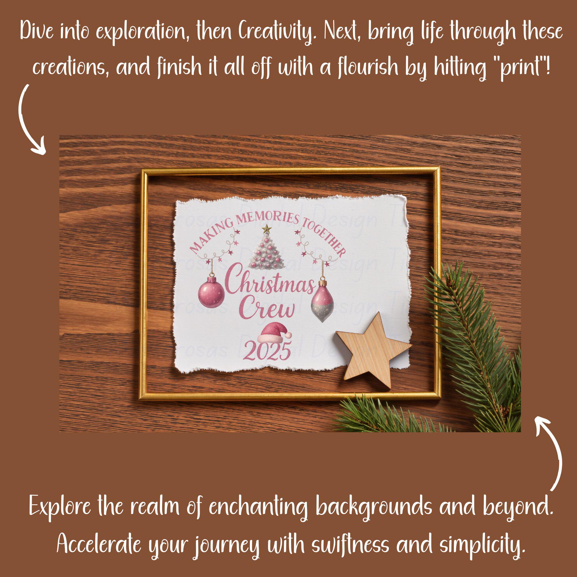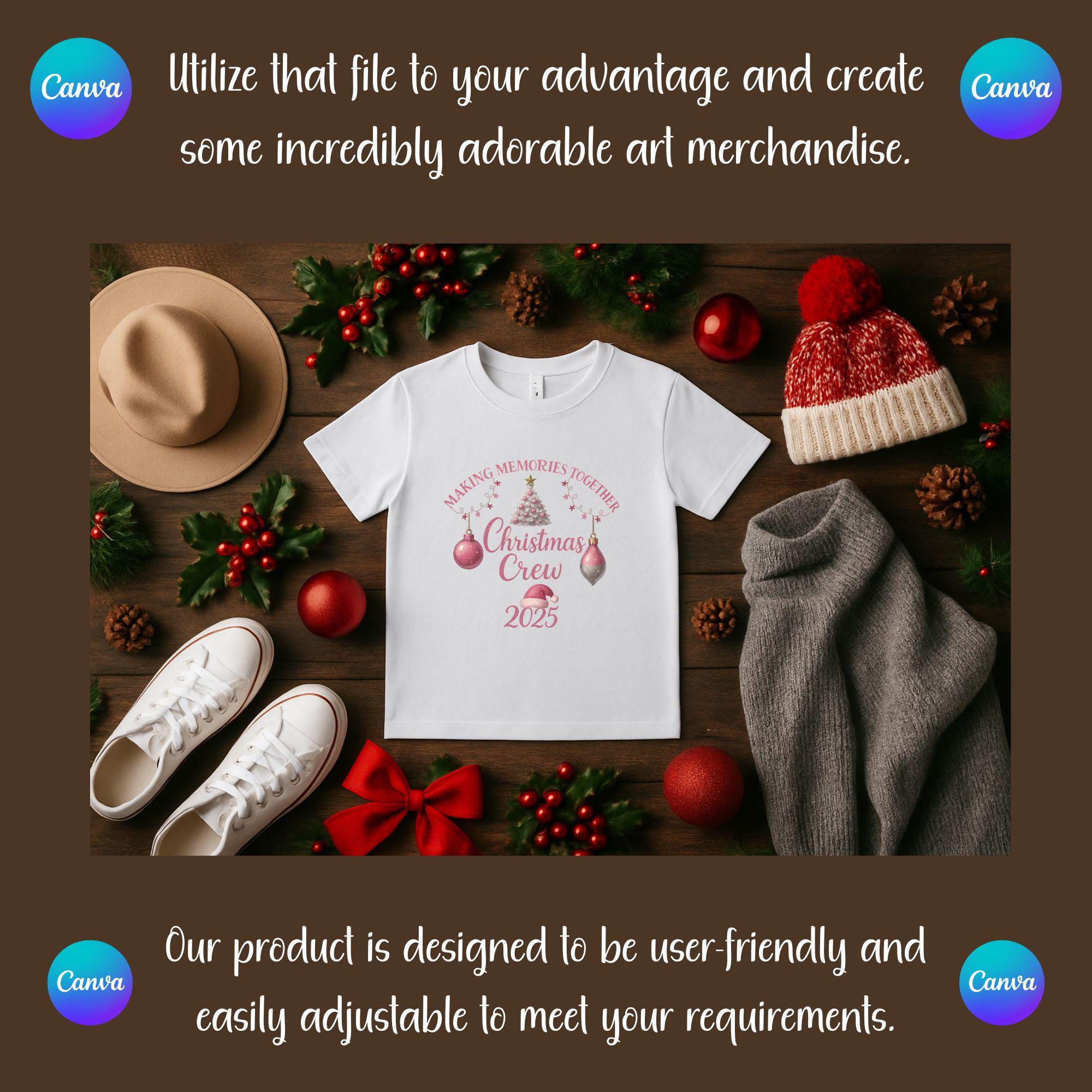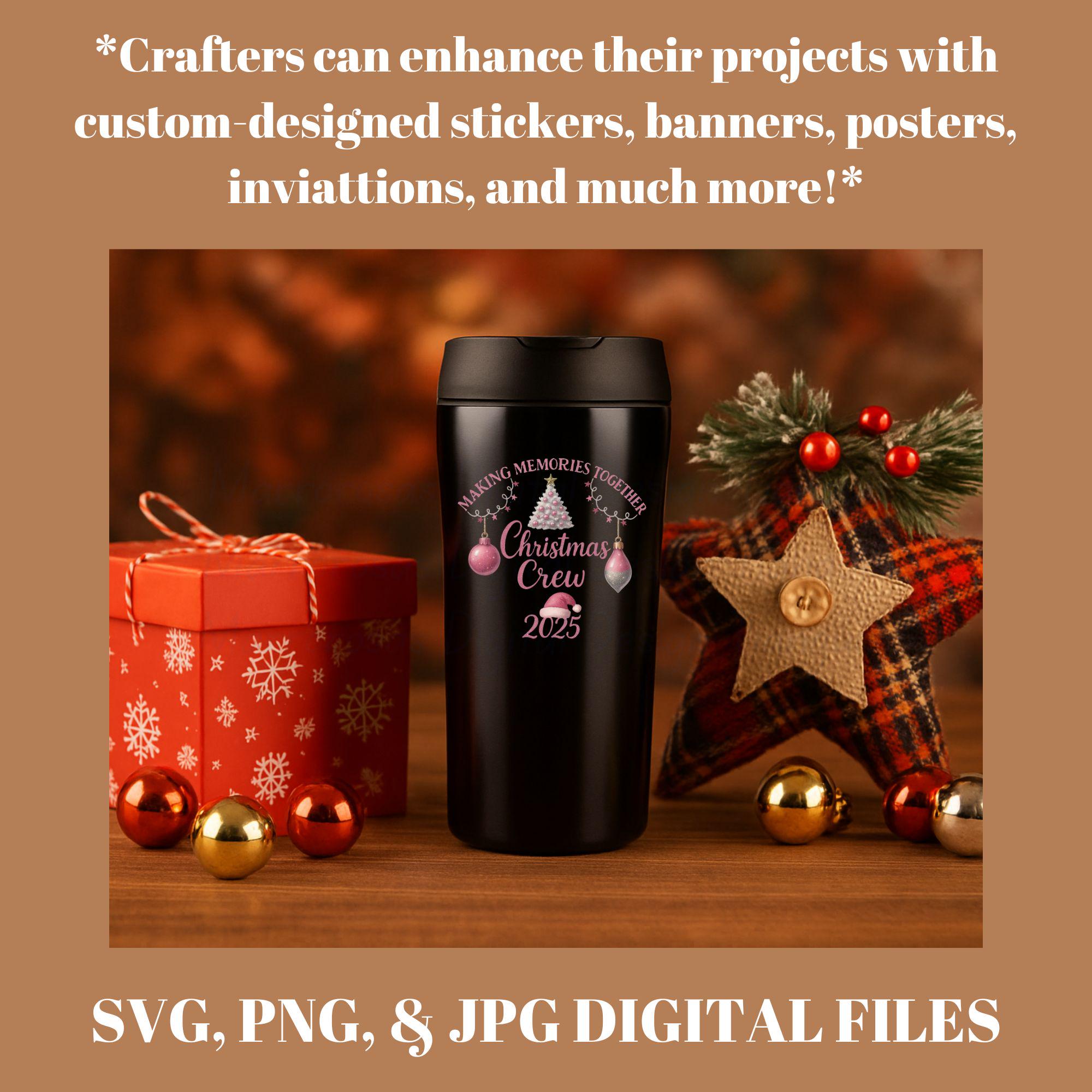 Bring festive charm, family unity, and sparkling holiday style to your Christmas creations with this beautifully crafted pink glitter Christmas crew design! This digital artwork features a soft, snowy white Christmas tree decorated with pink and silver ornaments, elegant glitter-style lettering, aesthetic ornaments, and a cute pink Santa hat resting over “2025.” Perfect for matching family outfits, holiday gatherings, Christmas pajamas, school events, and holiday parties!... Making Memories Together Christmas Crew 2025 is a very cute and lovable digital design/art that can be used in many different ways. Great for gifting either him or her. This digital design product comes in 3 different DIGITAL file types (PNG, SVG, & JPG) and also 1 PDF File to accommodate any of your needs. Files are resizable and printable!