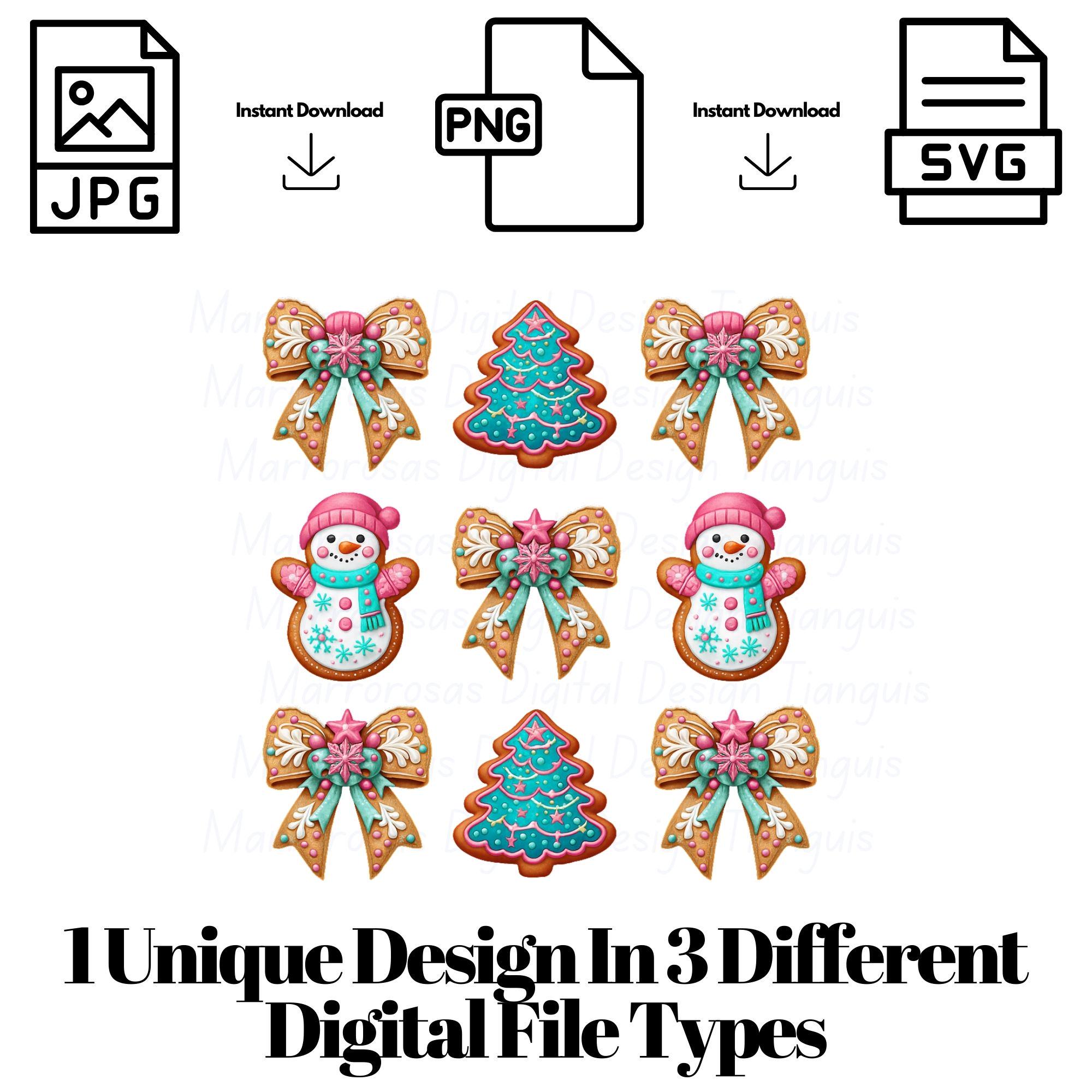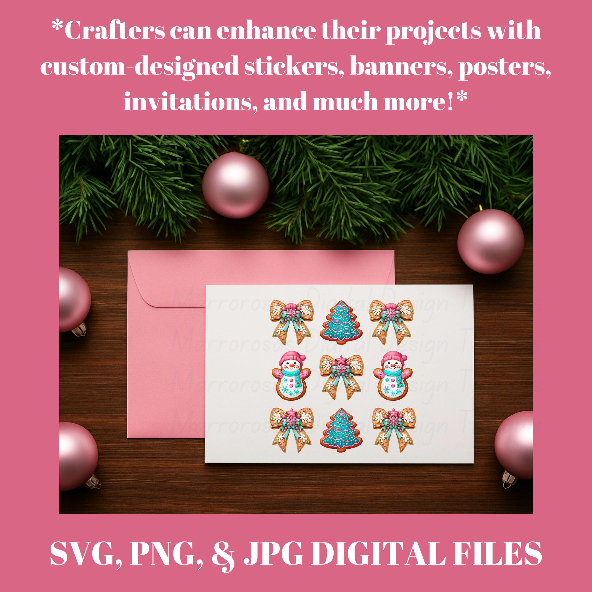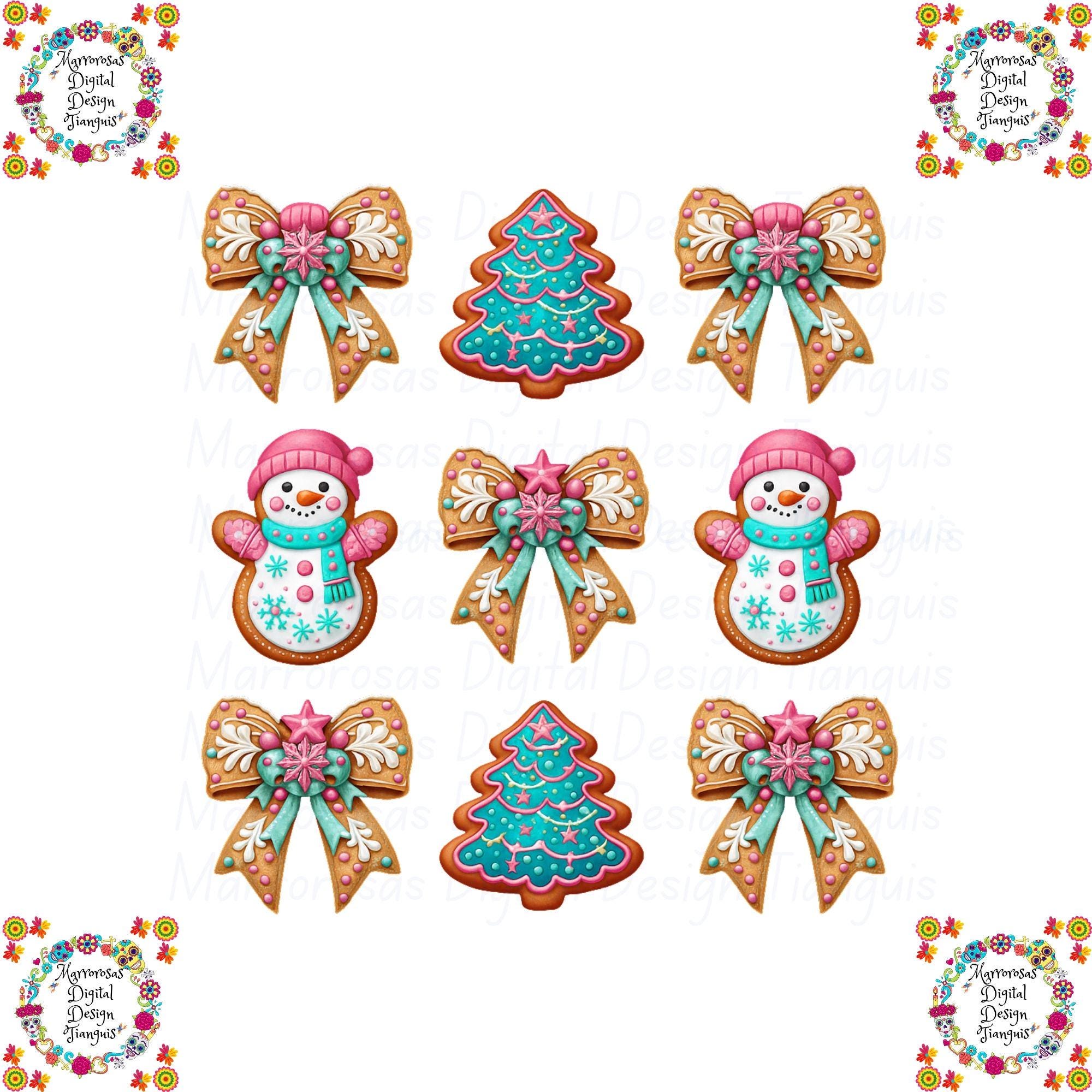 This design blends handcrafted cookie charm with bright seasonal colors like pink, teal, and white, creating a look that feels both nostalgic and modern. The added pink bows, frosty details, and festive accents make this artwork ideal for holiday crafting, apparel design, sublimation, invitations, stickers, décor, and so much more. Whether you're creating Christmas shirts, mugs, ornaments, or digital planners, this artwork will bring joy, sweetness, and instant holiday spirit to anything you make.