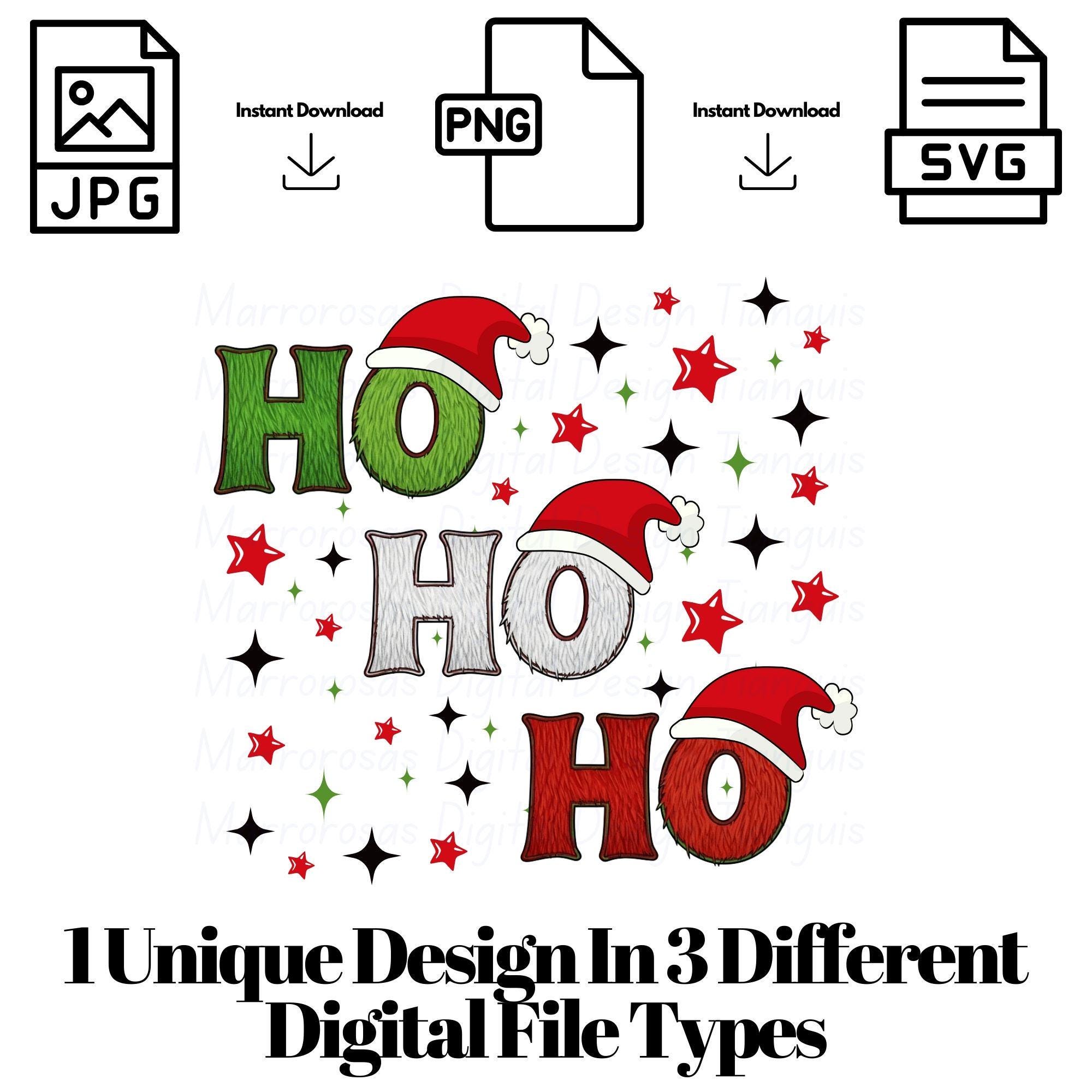 Bring bold holiday fun to your projects with this playful “Ho Ho Ho” Christmas digital design, featuring fuzzy, textured lettering inspired by classic Christmas colors and a mischievous holiday vibe. Each “HO” is styled in festive green, white, and red, topped with a cheerful Santa hat, and surrounded by sparkling stars for extra holiday magic. This eye-catching design is perfect for creating fun Christmas apparel, holiday gifts, decorations, and festive merch. The textured lettering gives the artwork a cozy, fuzzy look that pops beautifully on dark backgrounds, making it ideal for shirts, hoodies, sweatshirts, mugs, signs, and more. Designed with a clean, high-resolution finish, this digital file is ready to use for DTG printing, sublimation, DTF, and digital crafting. Whether you’re a small business owner, crafter, or DIY gift maker, this design adds humor, personality, and Christmas cheer to any project.....Grinch Ho Ho Ho is a very cute and lovable digital design/art that can be used in many different ways. Great for gifting either him or her. This digital design product comes in 3 different DIGITAL file types (PNG, SVG, & JPG) and also 1 PDF File to accommodate any of your needs. Files are resizable and printable!