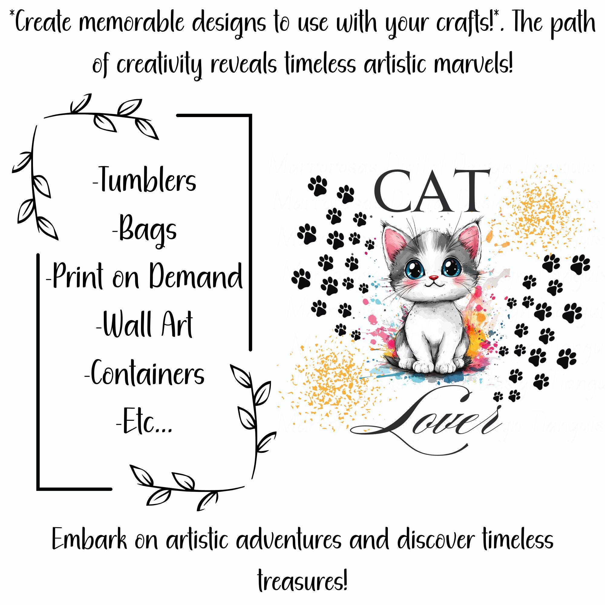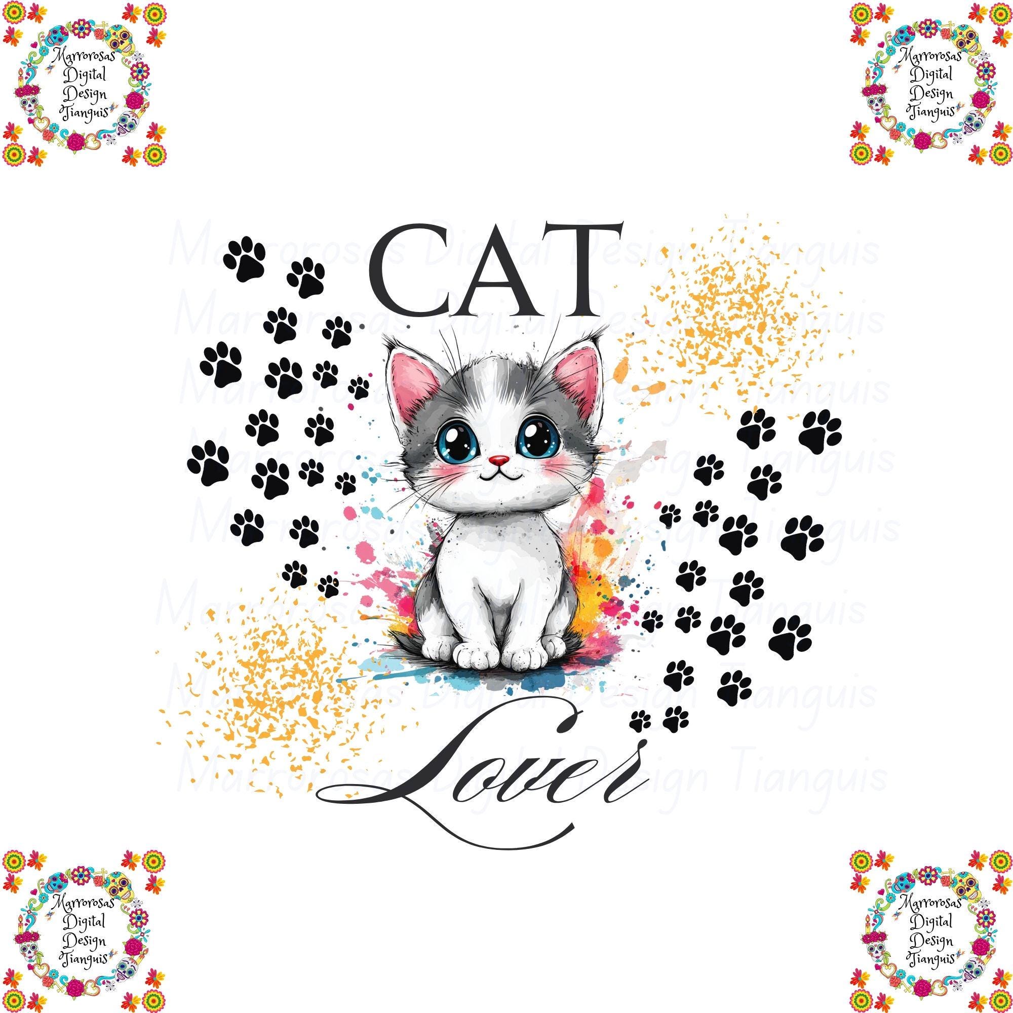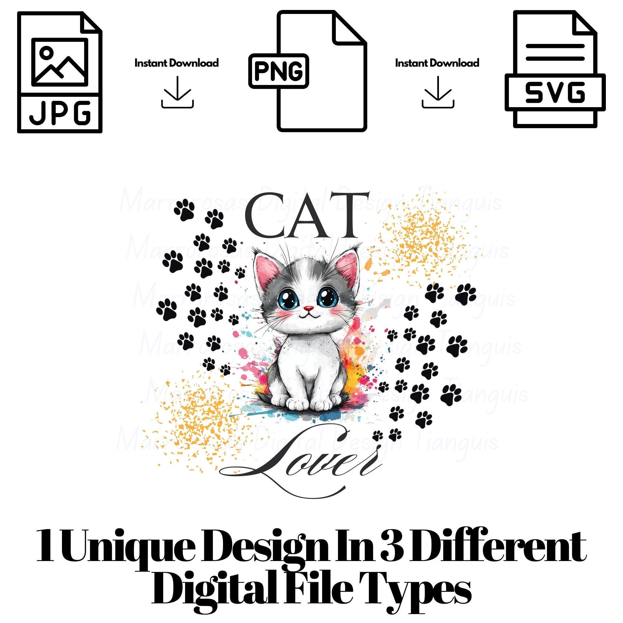 Celebrate your love for cats with this adorable and artistic “Cat Lover” digital design! Featuring a sweet wide-eyed kitten with soft pastel tones, expressive eyes, and delicate whiskers, this design is surrounded by artistic splashes of color, subtle paw prints, and a modern paint-splatter effect that brings charm and personality to life. The soft watercolor textures combined with bold contrast create a magical, heartwarming design that is perfect for cat lovers, pet parents, animal enthusiasts, and gift-givers. This artwork captures both sweetness and creativity, making it ideal for apparel, home décor, accessories, and small business creations. This digital file is delivered in high resolution with a transparent background, making it easy to use for a wide variety of print and craft projects... Cat paw lover is a very cute and lovable digital design/art that can be used in many different ways. Great for gifting either him or her. This digital design product comes in 3 different DIGITAL file types (PNG, SVG, & JPG) and also 1 PDF File to accommodate any of your needs. Files are resizable and printable!