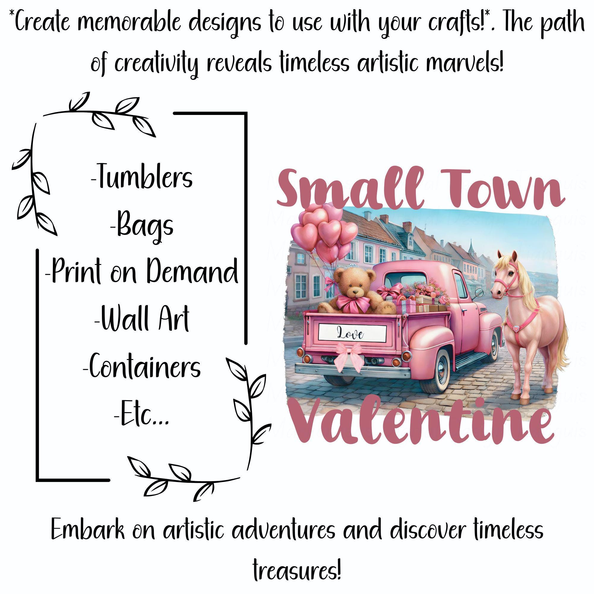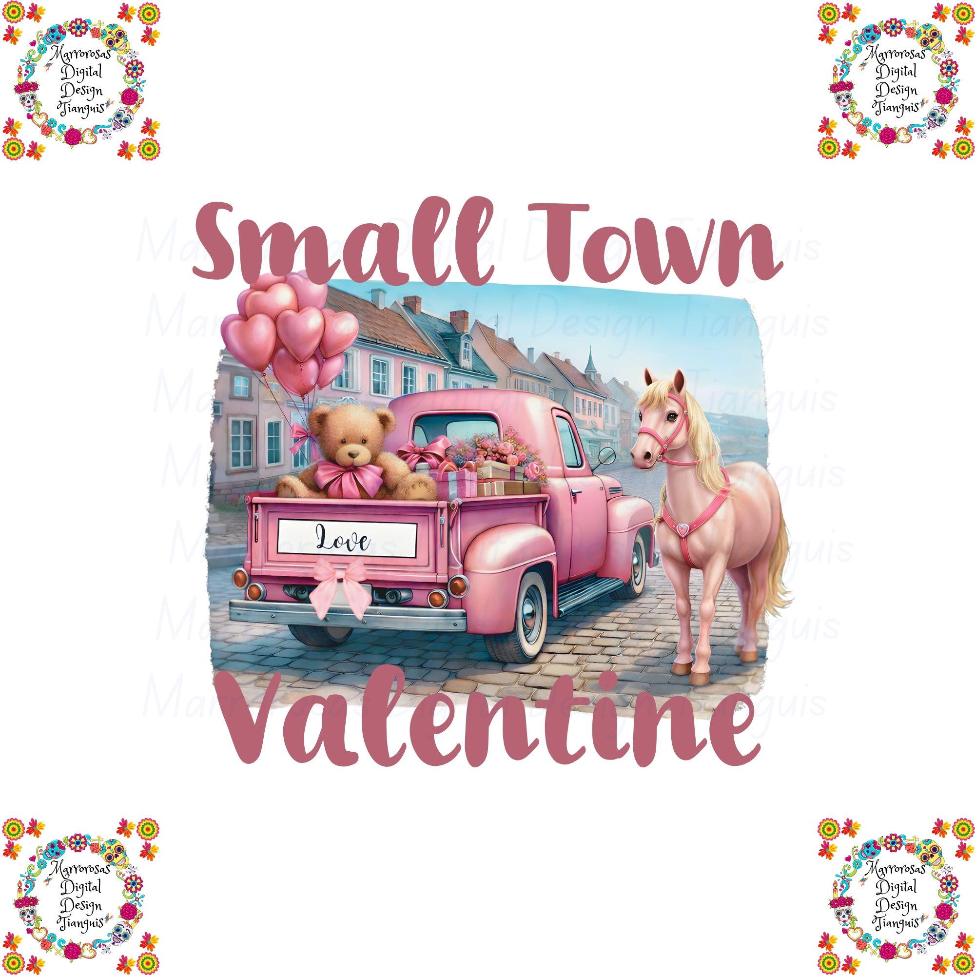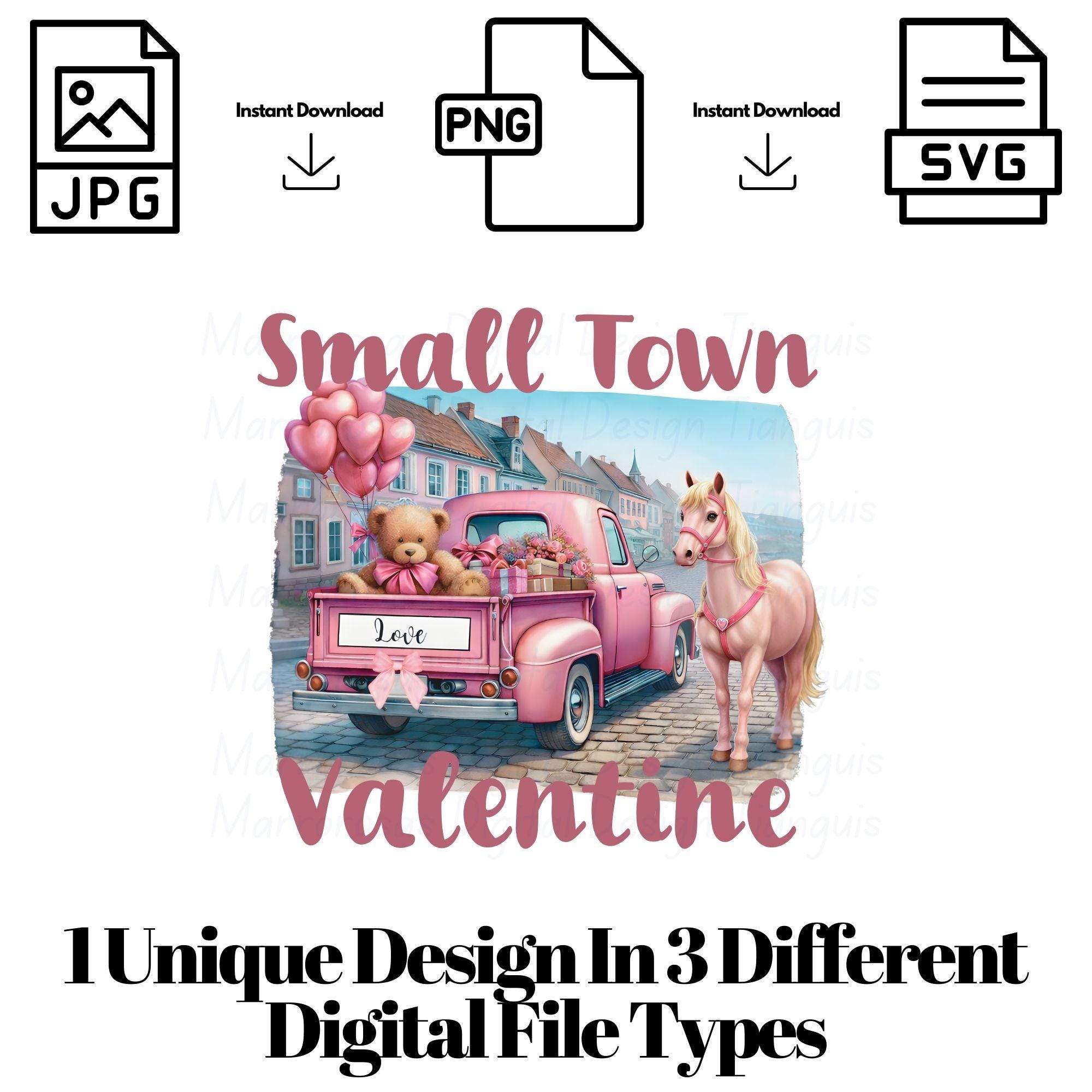 Bring soft country charm and sweet Valentine vibes to your projects with this adorable Small Town Valentine digital design. This whimsical artwork features a vintage pink pickup truck filled with heart-shaped balloons, a cuddly teddy bear holding love gifts, delicate florals, and a beautiful pink horse — all set against a clean white background with romantic pastel tones. This design blends rustic farmhouse style, Western charm, and Valentine sweetness, making it perfect for trendy apparel, gifts, and decor that shoppers love year after year. Whether you're creating t-shirts, sweatshirts, mugs, tumblers, stickers, cards, or wall art, this design is guaranteed to stand out with its soft aesthetic and boutique-ready appeal.... Small Town Valentine is a very cute and lovable digital design/art that can be used in many different ways. Great for gifting either him or her. This digital design product comes in 3 different DIGITAL file types (PNG, SVG, & JPG) and also 1 PDF File to accommodate any of your needs. Files are resizable and printable!