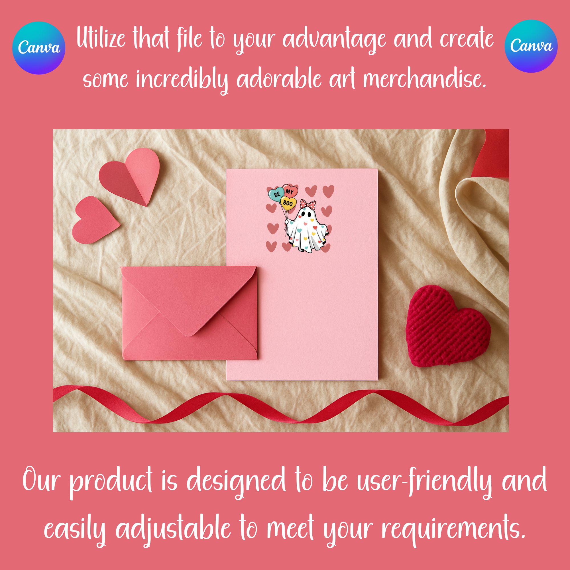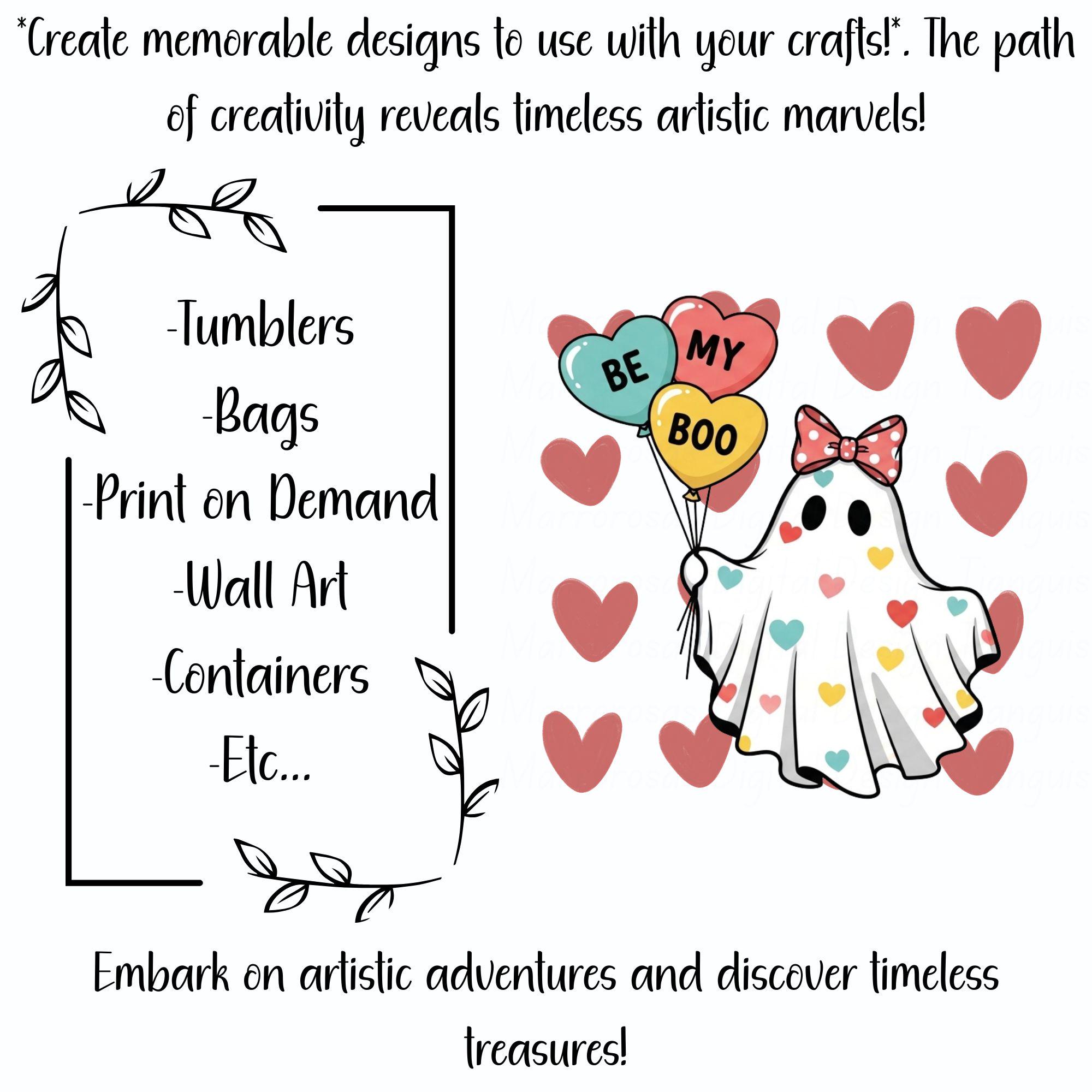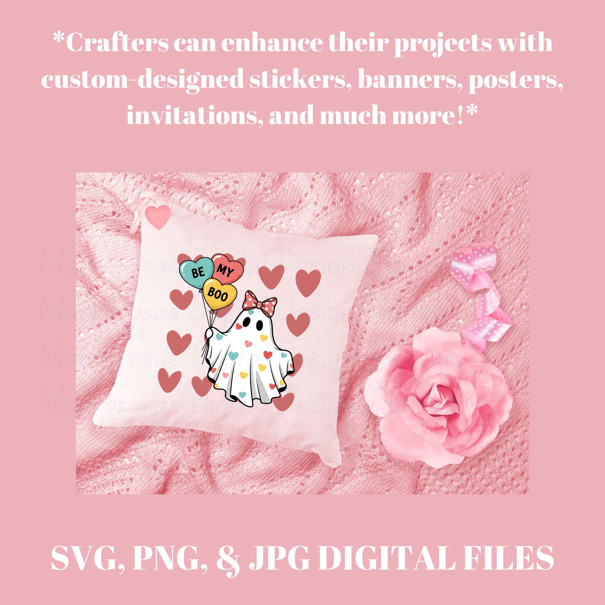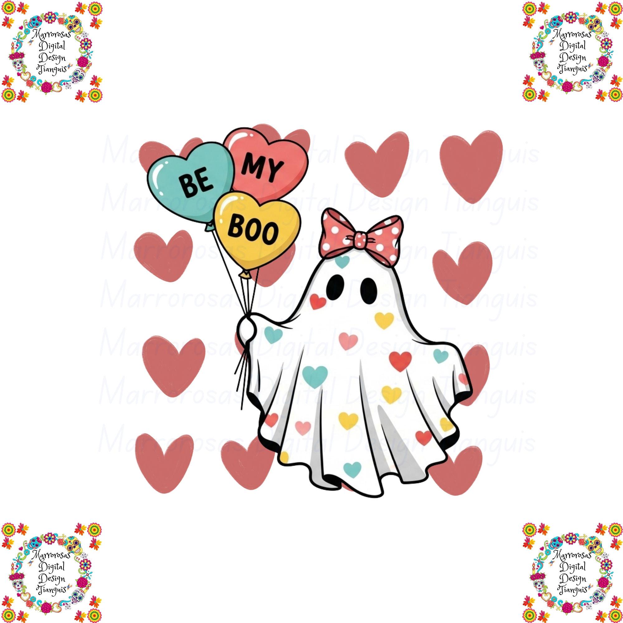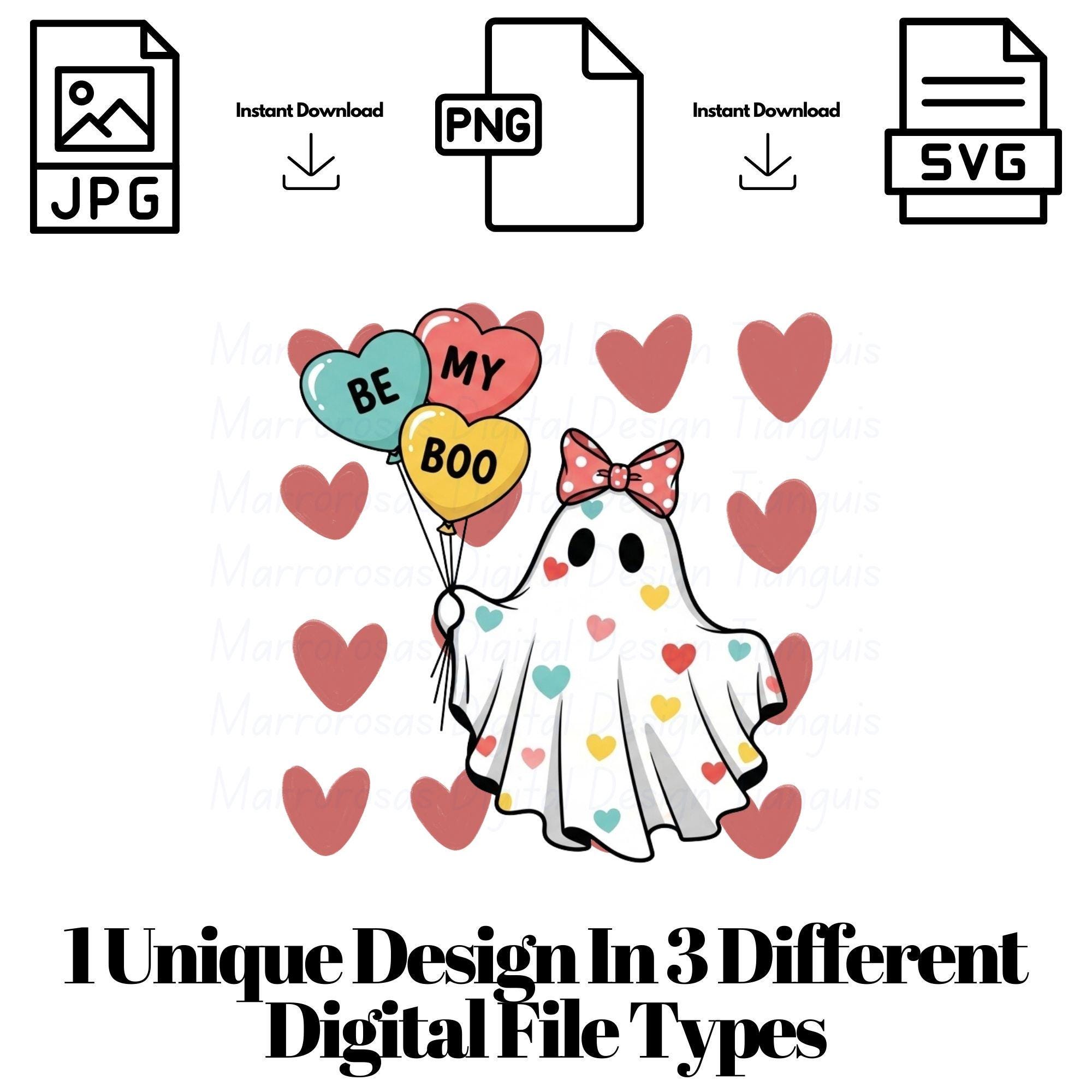 Fall in love with this adorable “Be My Boo” Valentine Ghost digital design! This cute cartoon aesthetic ghost is covered in colorful heart details and holds three heart-shaped balloons that spell out Be • My • Boo, making it the perfect playful Valentine’s Day design. Finished with a big, sweet bow and soft pastel tones, this artwork blends cute vintage pin-up vibes with modern Valentine aesthetics for a trendy, boutique-quality look. This high-resolution digital file is perfect for creating Valentine T-shirts, hoodies, stickers, tumblers, mugs, cards, wall art, and party decor. Whether you’re making gifts for your boo, your besties, or creating products for your shop, this design is guaranteed to stand out and sell fast during Valentine season..... Be my boo is a very cute and lovable digital design/art that can be used in many different ways. Great for gifting either him or her. This digital design product comes in 3 different DIGITAL file types (PNG, SVG, & JPG) and also 1 PDF File to accommodate any of your needs. Files are resizable and printable!
